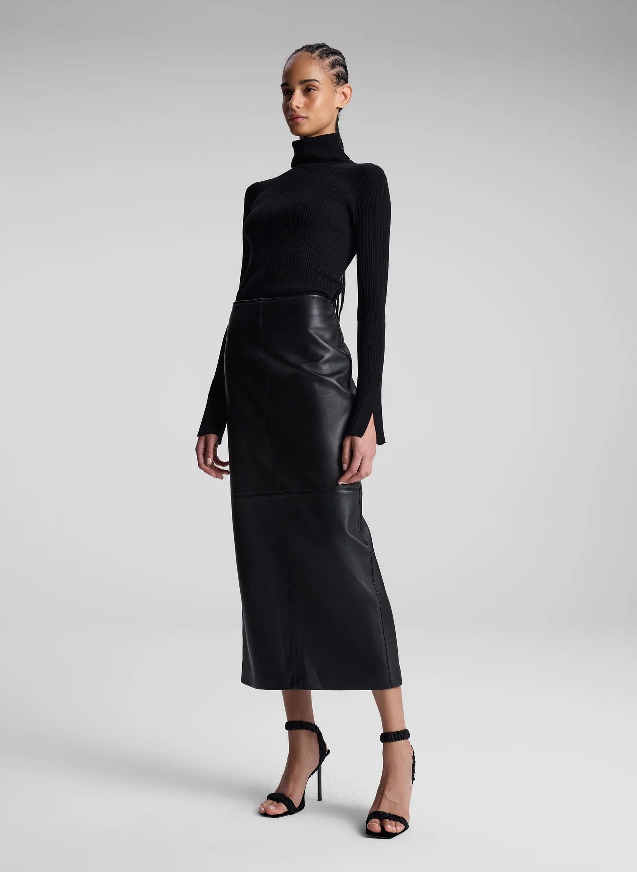 The Marta Skirt is A.L.C's modern take on a classic column silhouette—crafted from supple lamb leather that moves with you. The mid-rise, midi-length style boasts an effortlessly cool fit, with a long, clean line that flatters every shape. Sleek yet functional, its fully lined and finished with a back slit for ease. This is the piece that does it all—refined, confident and endlessly versatile.