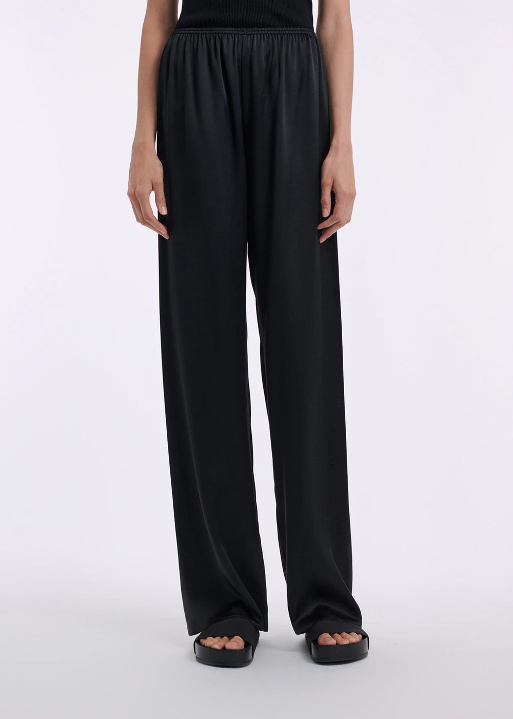 A full-length relaxed pant in 100% silk, featuring an elastic waistband and high rise fit.