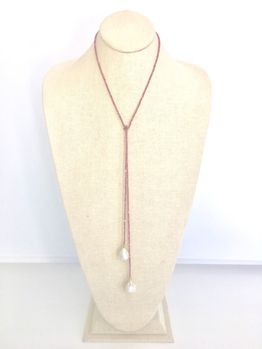 This necklace is faceted with 3 mm tourmaline beads with gold findings and baroque pearl ends. Can be worn numerous ways.