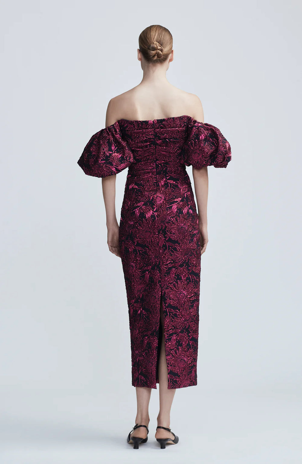 Inspired by baroque Venetian tapestry and lace, opulent gilded Sunflower Jacquard is rich with tactile luxury. With a sweeping gondola neckline, fitted sheath silhouette, and luscious gathered puff sleeves, this is a celebration of both exquisite artistry and effortless style.