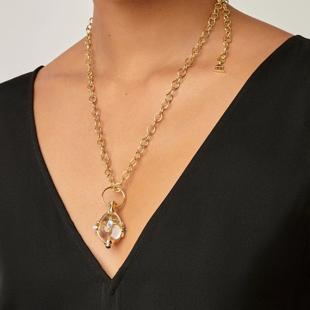 The 18K Blue Moon Amulet adds the magic of Blue Moonstone to the classic rock crystal amulet. North, south, east and west are each represented by a cabochon-cut Blue Moonstone. A single tanzanite at the base brings an otherworldly glow to the already luminous natural rock crystal.