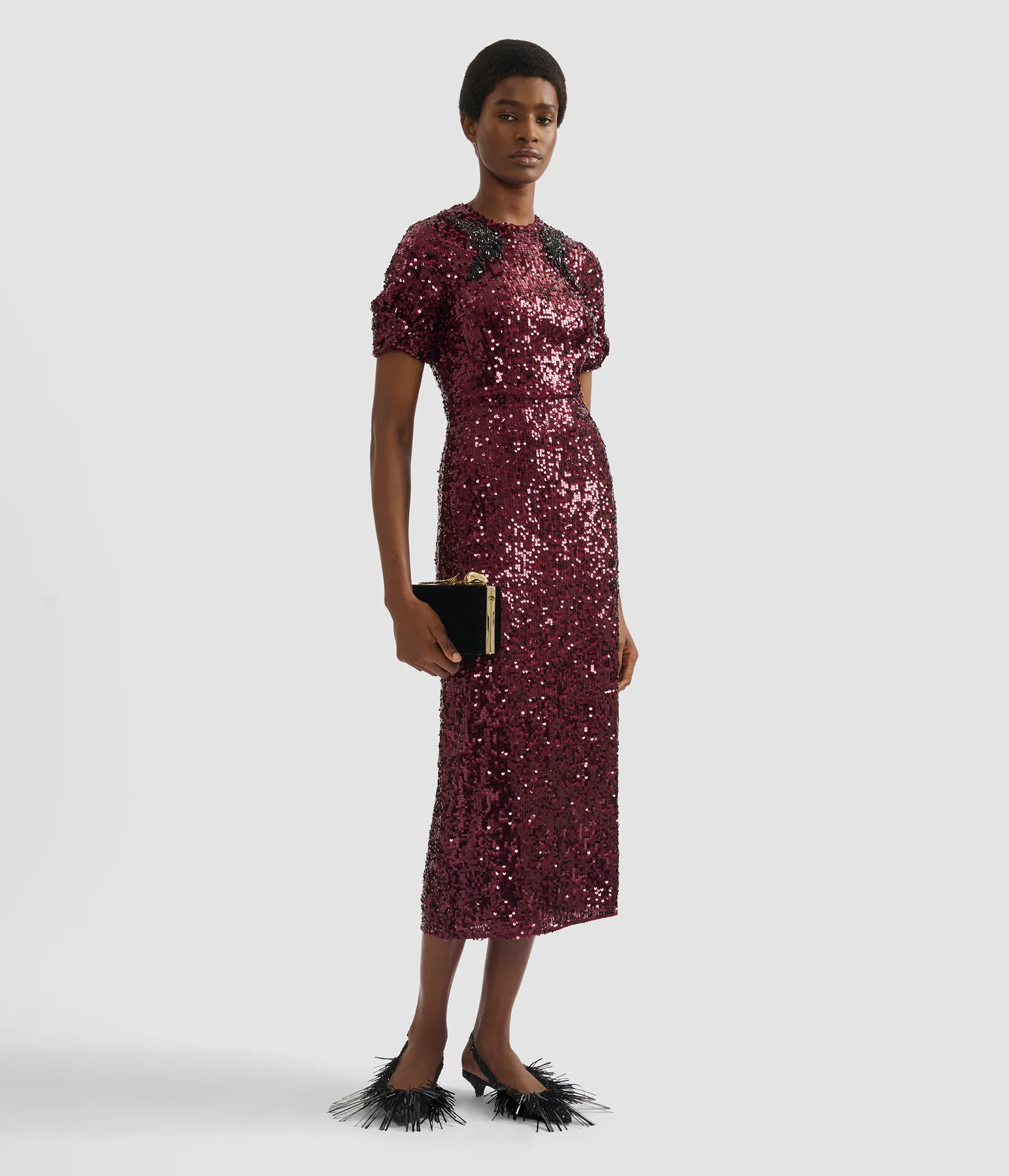 Cut from georgette covered in mulberry sequins, this fitted dress has black crystal embroidered appliqués at the crew neck.