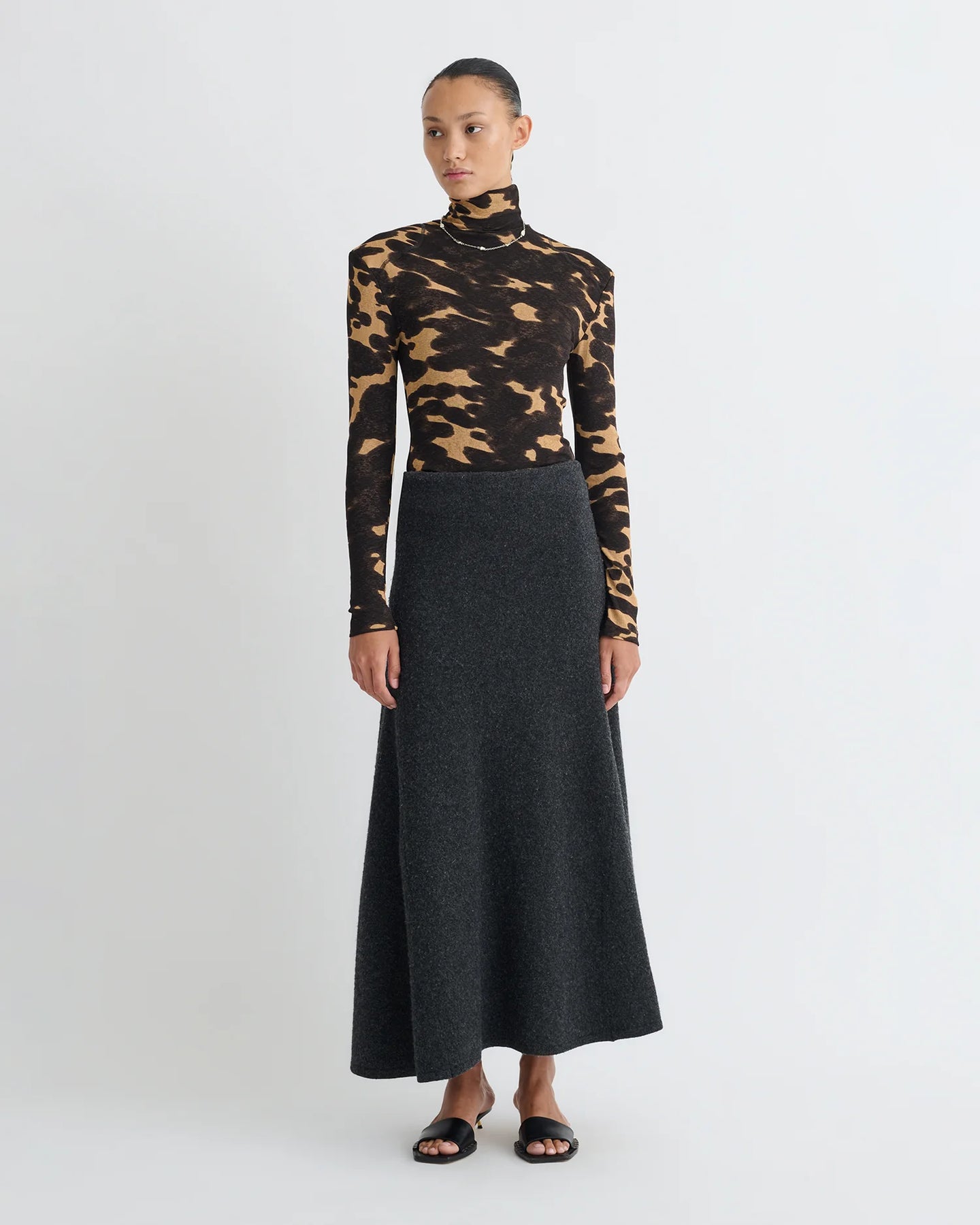 The Nayeli Top from Nanushka reimagines a classic turtleneck through the Fall-Winter 25 Grow collection’s lens of transformation. Crafted from delicate mesh jersey, its grown-on neckline and wide shoulders sculpt a modern, confident silhouette. Rendered in midnight mocha apricot, it offers a striking yet lightweight layer, designed to empower and evolve with the wearer’s shifting sense of self
