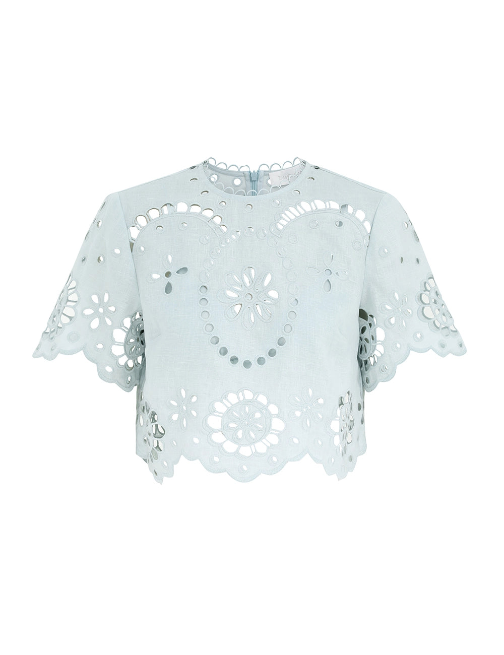 The Awaken Embroidered Bodice in Mint from the Resort Swim 2026 Collection. A linen top featuring short sleeves, an invisible centre back zip closure and scalloped trim at the sleeve cuffs and hem.