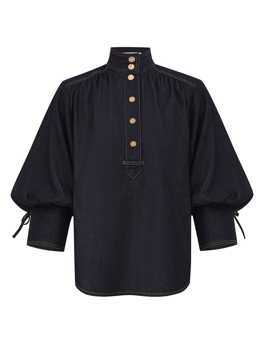 The Denim Billow Shirt in Night Sky from the Cruise 2026 Collection, Twisted Romance. A denim shirt featuring a stand collar, billow sleeves with fitted cuffs and rouleau ties, finished with gold buttons down the centre front.