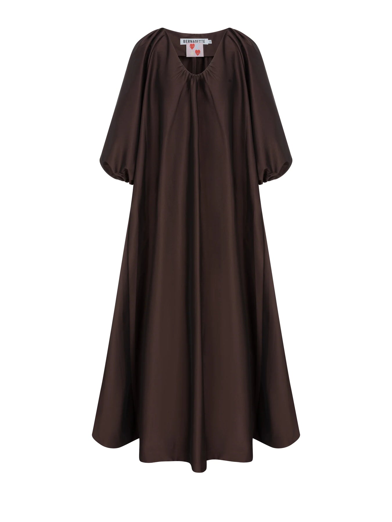 BERNADETTE’s icon, Dress George, reimagined in chocolate brown. This floor-length gown is crafted from their signature taffeta with a flattering V-neck and voluminous puffed sleeves. A timeless statement, George is made for candlelit winter dinners.