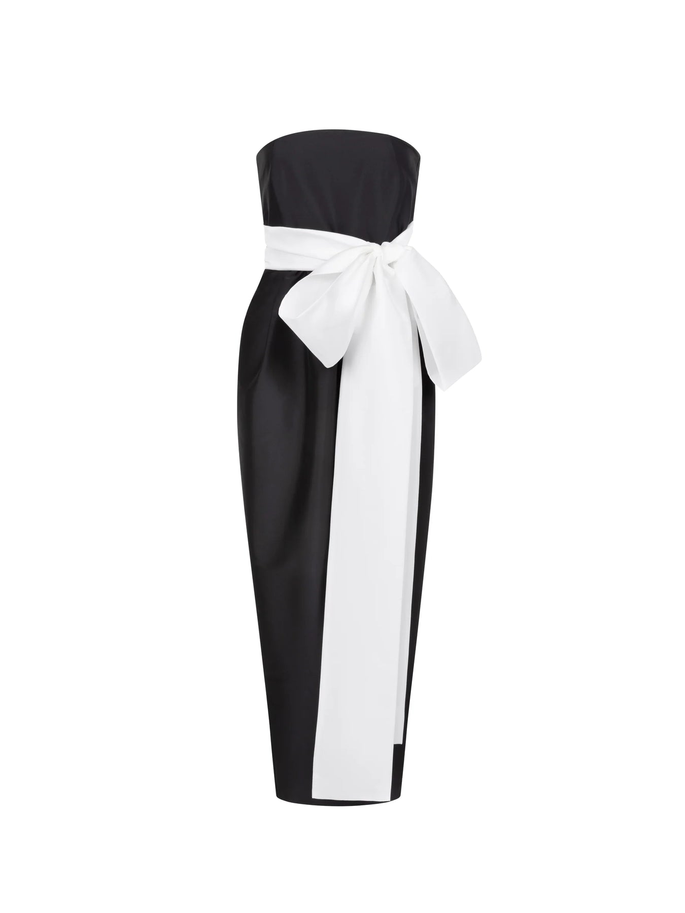 Dress Lina is crafted in sleek black, designed with a structured bustier and defined by an oversized ivory taffeta bow at the waist. Falling into a refined maxi silhouette with a tapered hem, it blends detail with refined sophistication—an elevated choice for the evening.