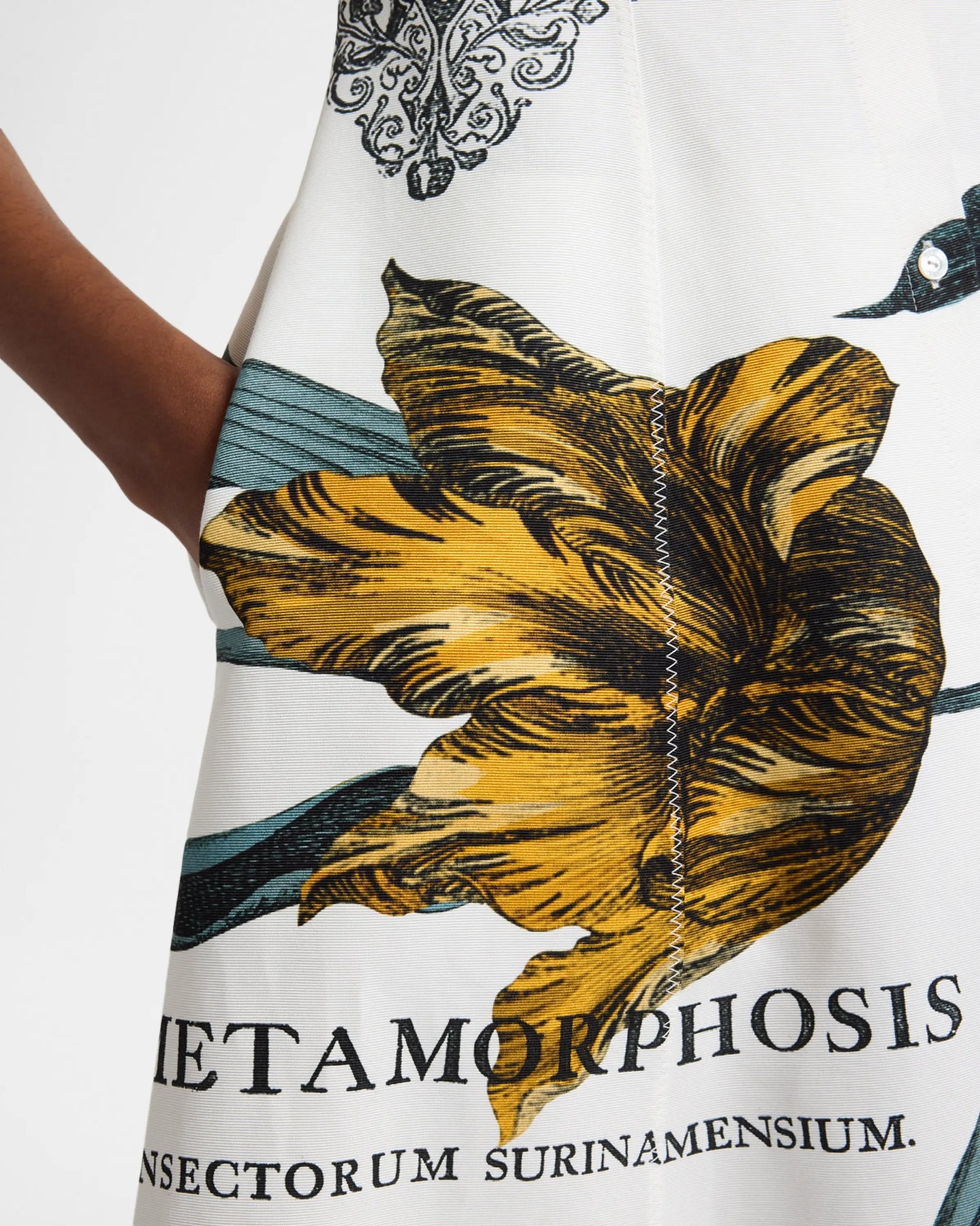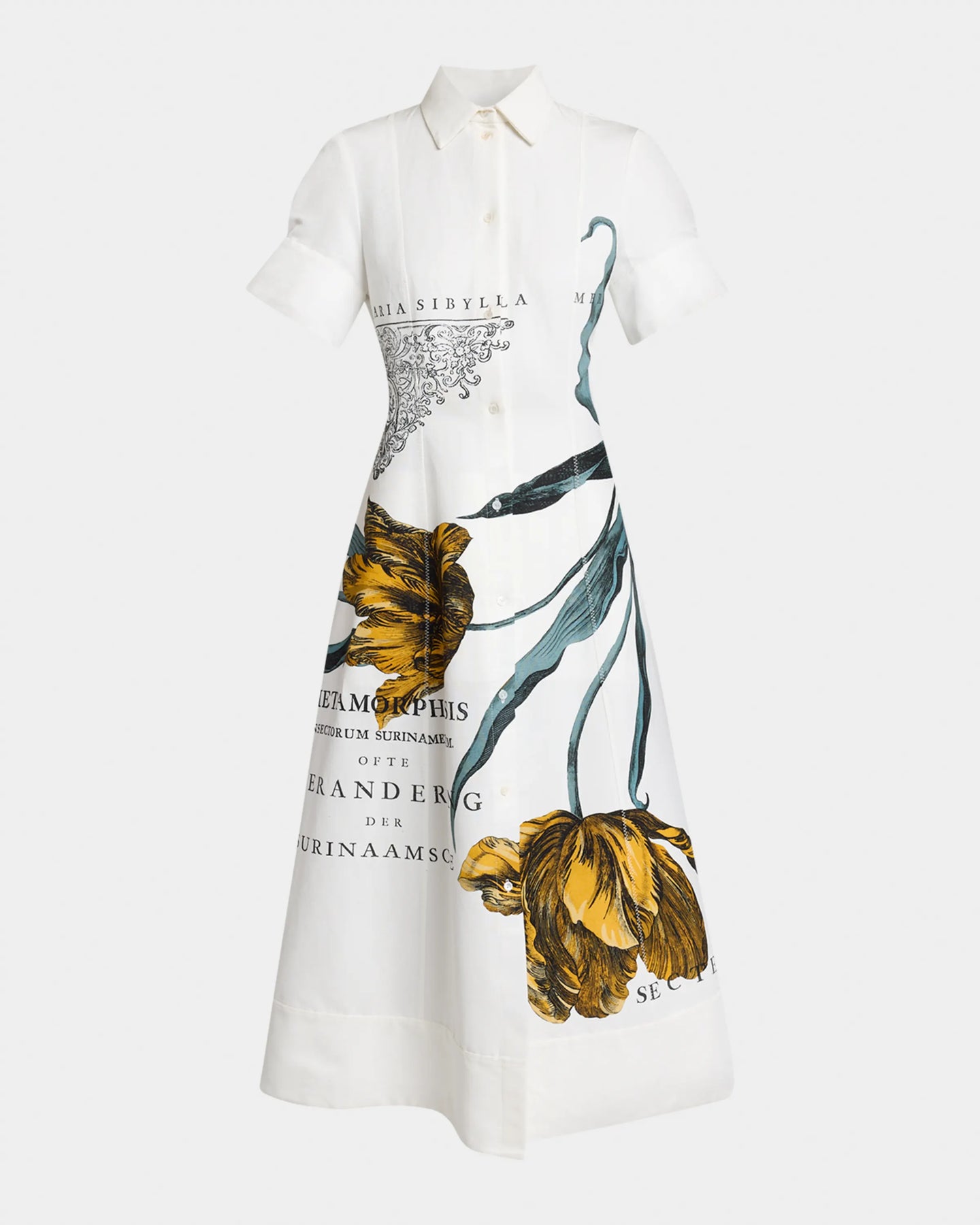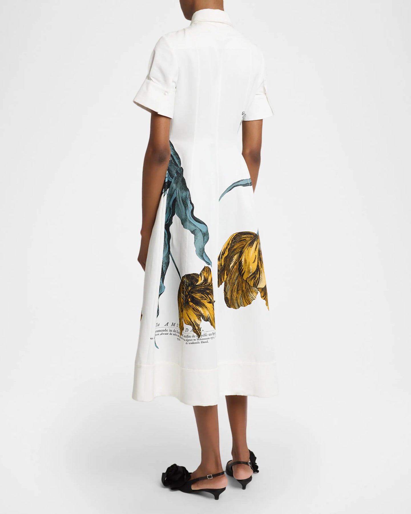 Cut from midweight faille, this Erdem midi dress features an oversized tulip etching as well as words from the books of entomologist Maria Sibylla Merian–the collection's muse.