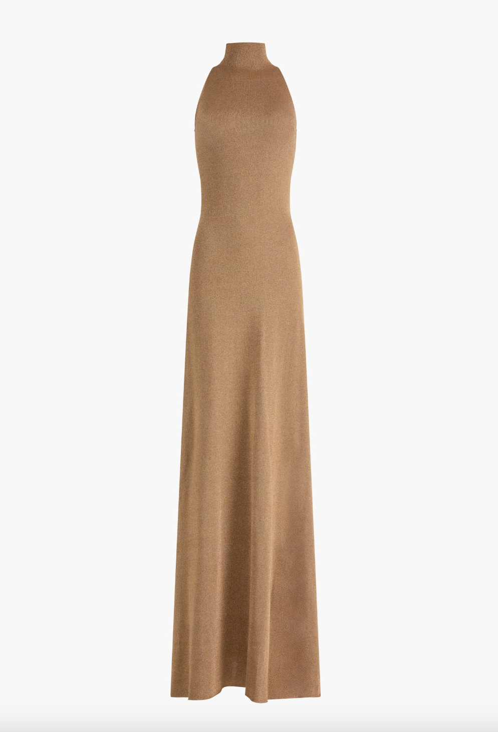 The Mitzi Dress has a dramatic maxi silhouette with a turtle neck. It's beautifully shaped to a close-fitting silhouette from viscose jersey that has a metallized fibre running through for a subtle sheen.