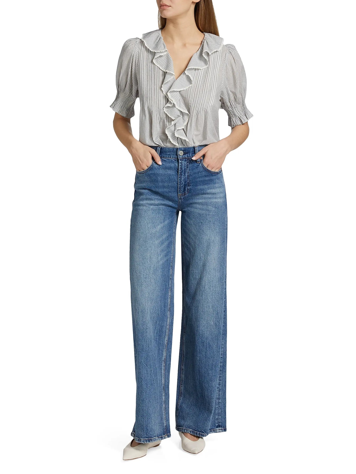 Crafted of cotton, this Henri striped top from DÔEN is styled with a V-neck, short puff sleeves, and delicate ruffles.