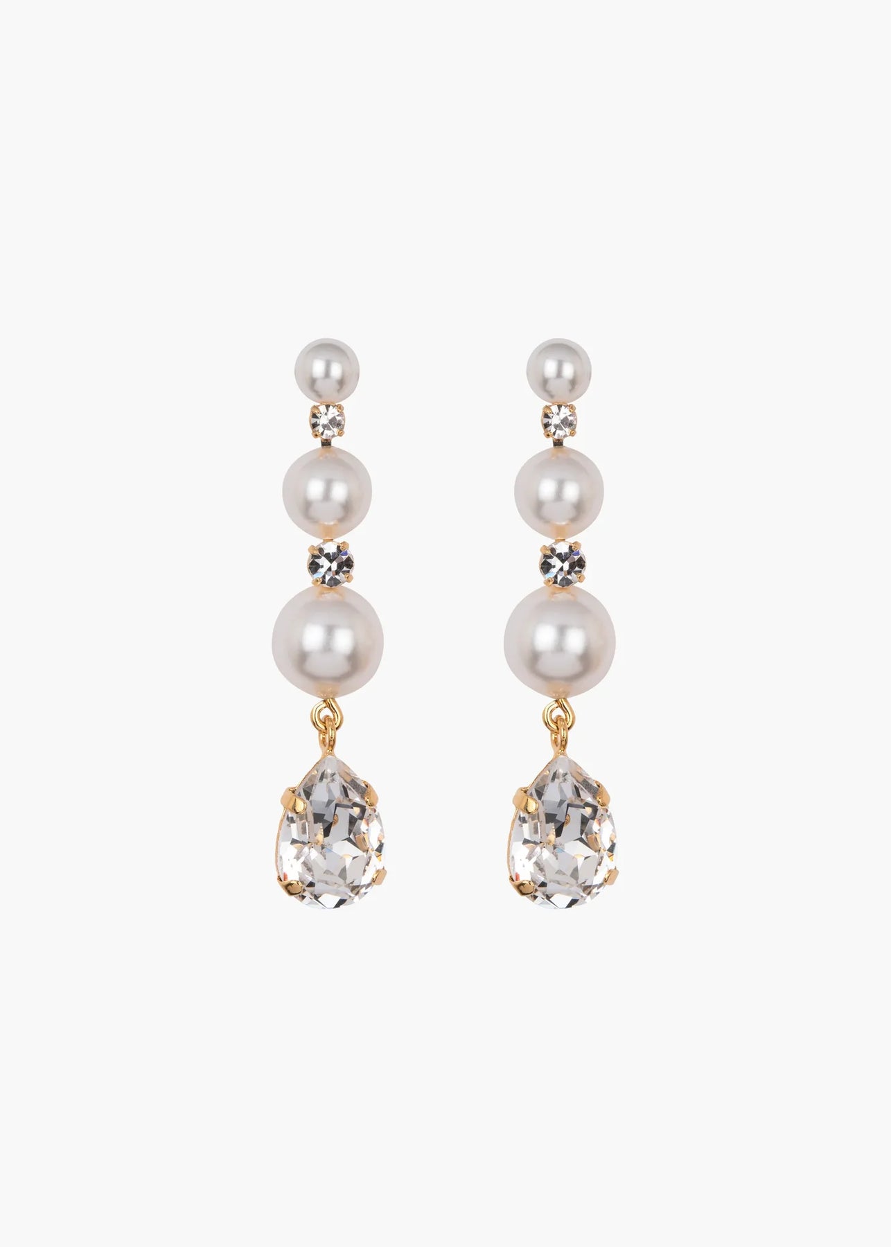 The utter definition of timeless style, the Corisande Earrings combine crystal and pearl in a linear drop earring. Each one is made by hand in New York, plated with 18-karat gold, and set with Austrian crystals and crystal pearls. The pear-cut crystal trails in a hinged drop, adding movement to the dynamic look. Dimensions: 2in x 3/8in