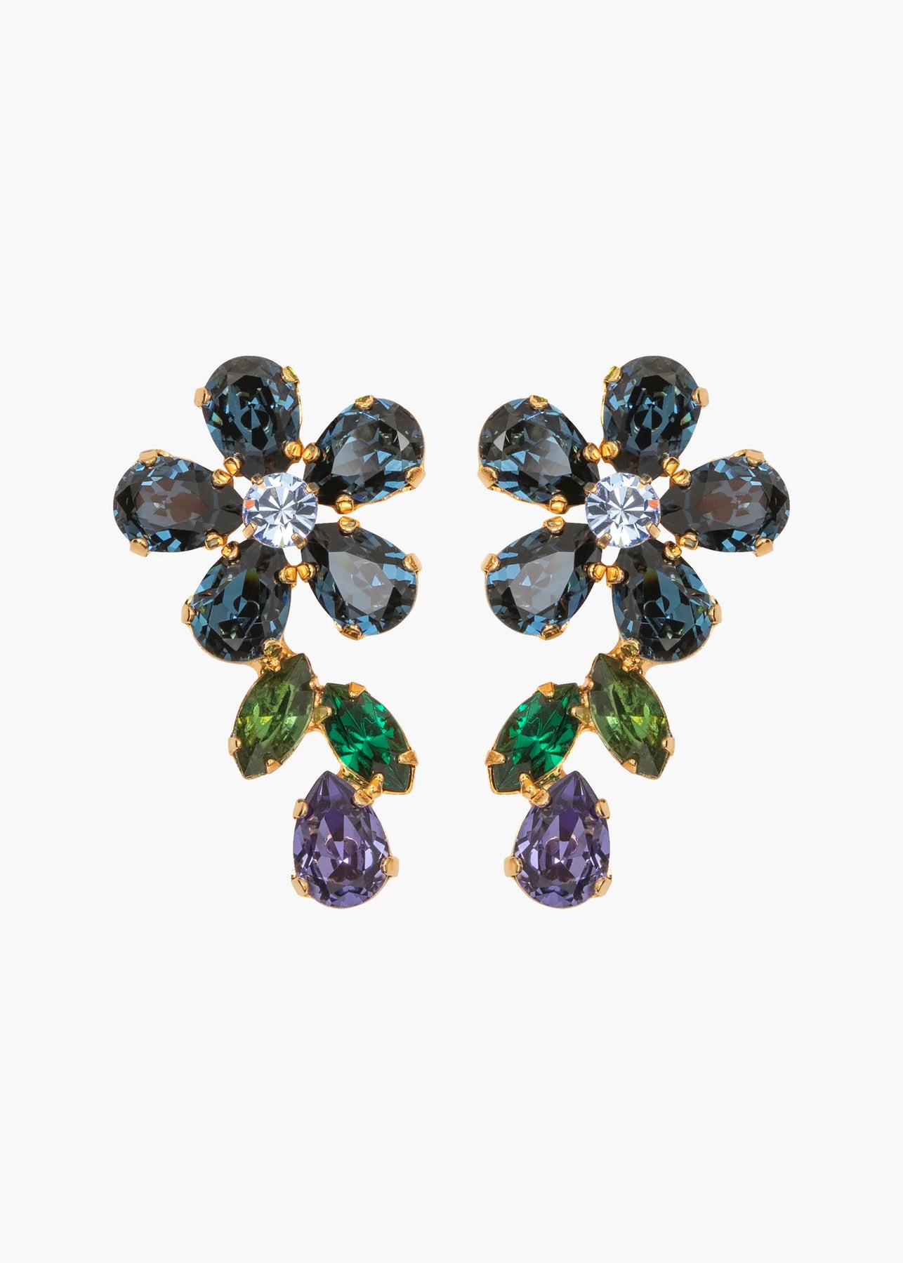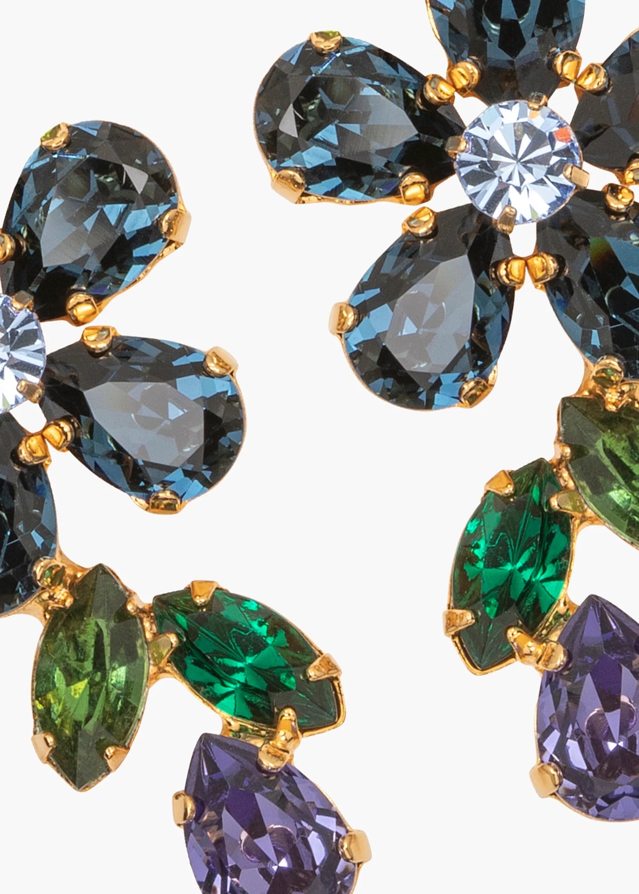An addition to the iconic collection of crystal flower earrings, the Odelia Earrings have the richly vivid palette of an Impressionist painting. Austrian crystals in an imaginative range of colors and cuts are lodged in an 18-karat gold-plated setting. Made by hand in New York, the placement of each individual stone is carefully considered in the design process, for a finished look that frames the face.