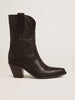 From Texas to Venice: the Wish Star Boots tell of journey and passions, creating a unique combination of Venetian artisan tradition and cowboy spirit. In this low version, these boots feature a black leather upper with black leather inlay star, and tone-on-tone embroidery on the leg. The black piping detail and gold-colored metal plaque engraved with the Golden Goose signature on the heel complete the look.