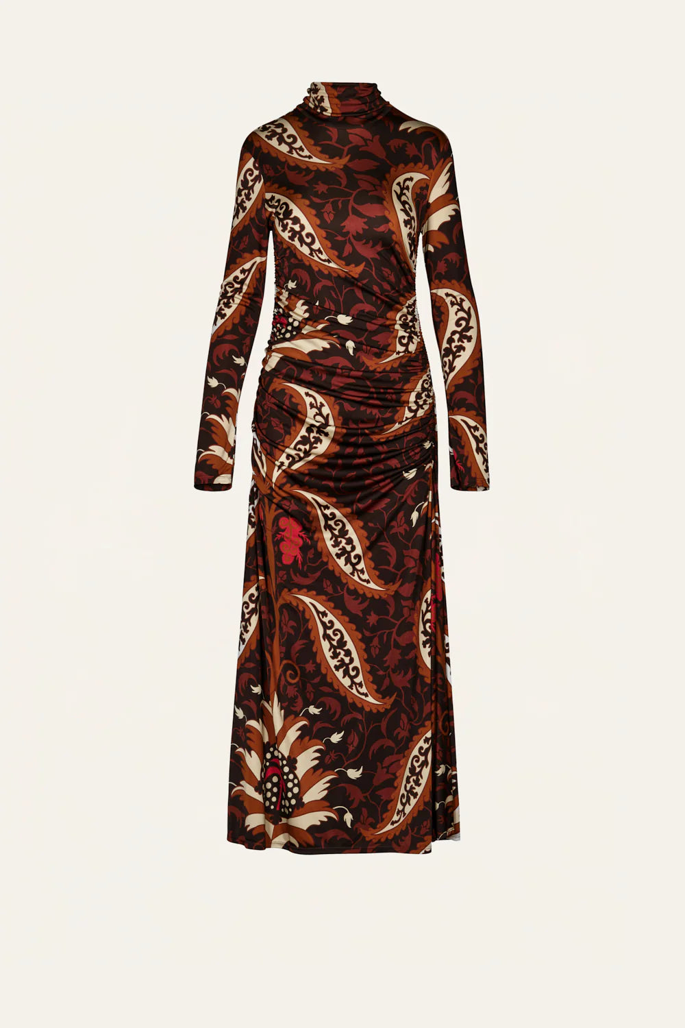 A long-sleeve jersey dress featuring an allover heritage print and ruched detailing through the waist and hips. The high neckline and elongated silhouette add definition, making it a sleek choice for day-to-evening transitions. Style with ankle boots or refined heels depending on the mood.