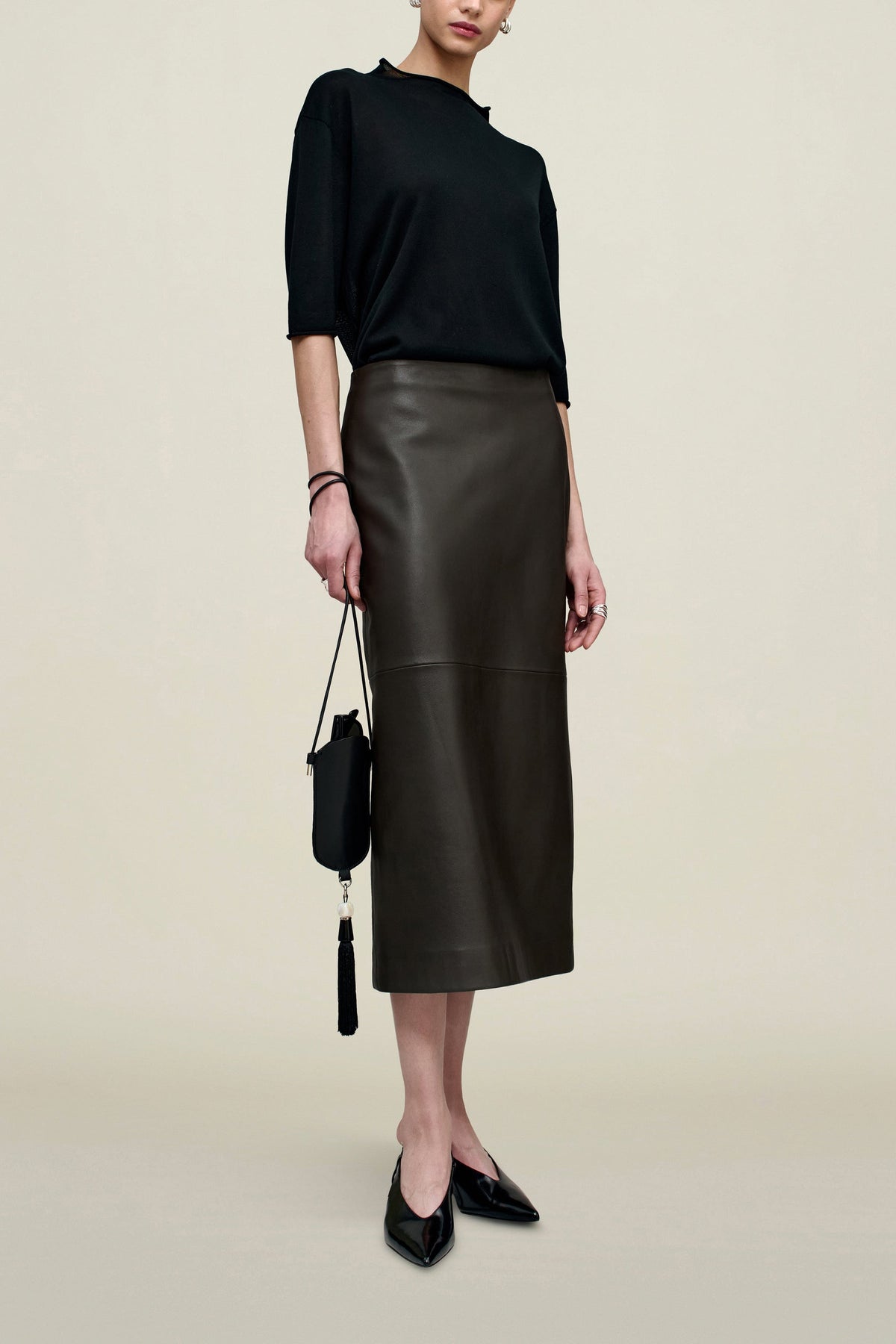 Modern midi pencil skirt in luxurious lambskin leather. Back slit provides movement while maintaining the sleek silhouette. Clean tailored construction with fitted cut through hips and thighs. Designed to sit slightly below natural waist with subtle shaping for a flattering profile. Pair with an easy knit or drapey top for elevated, everyday wear.