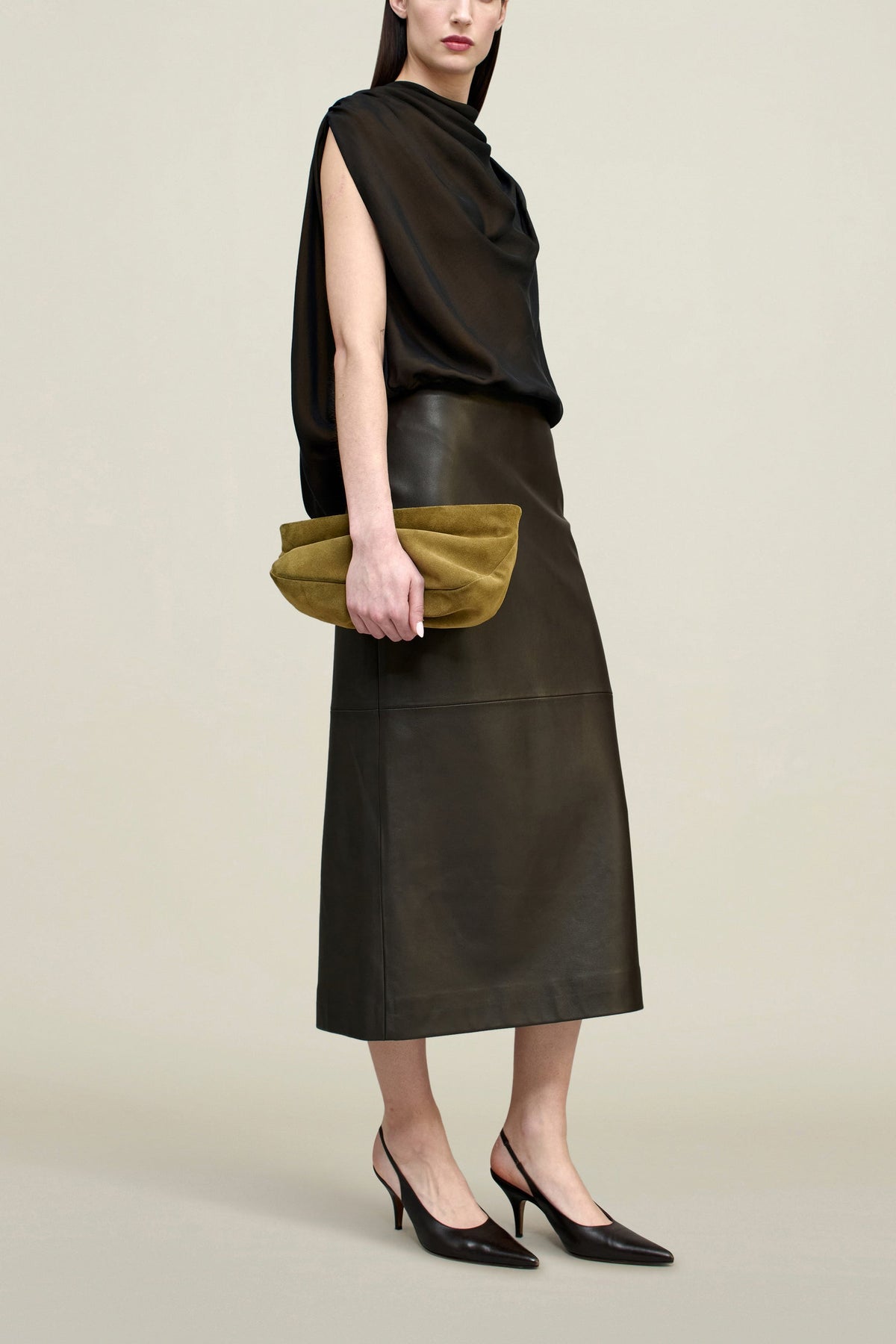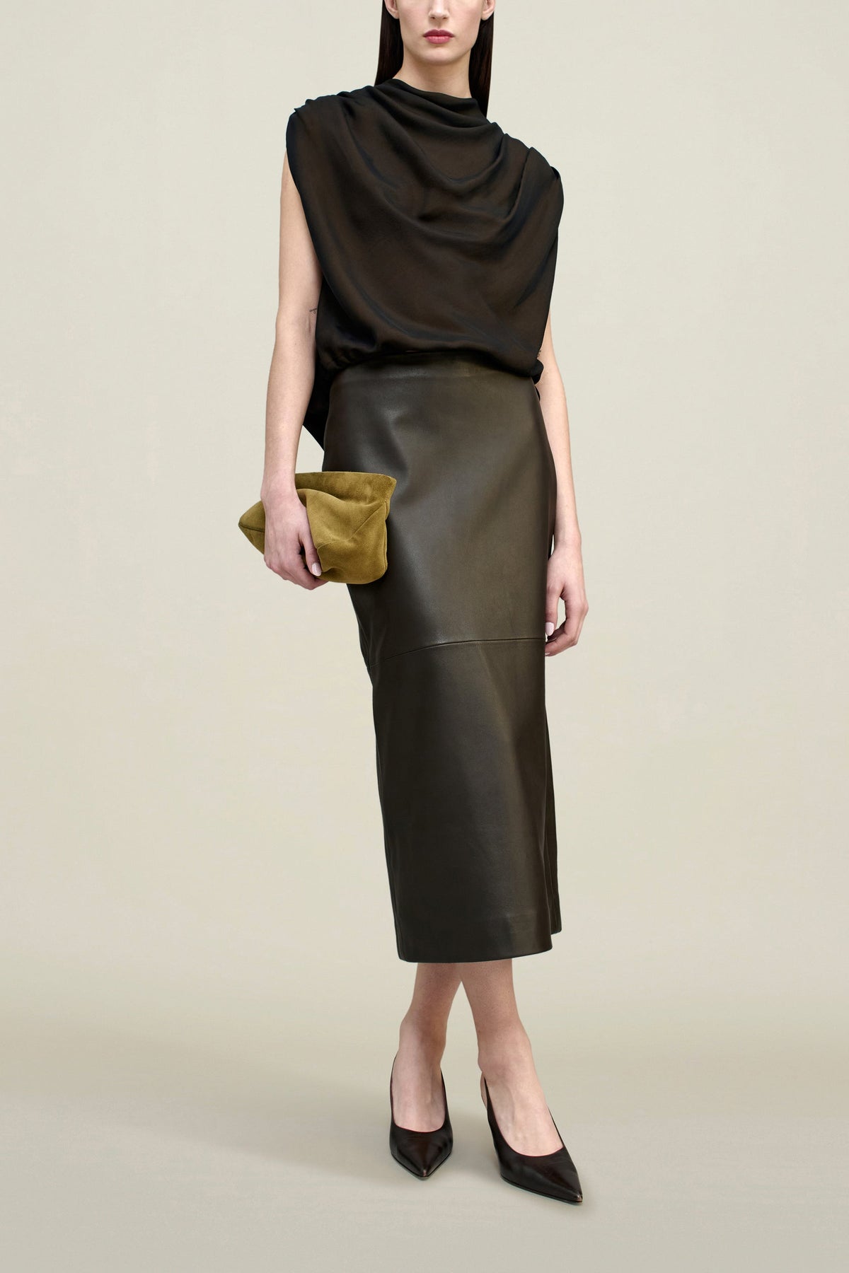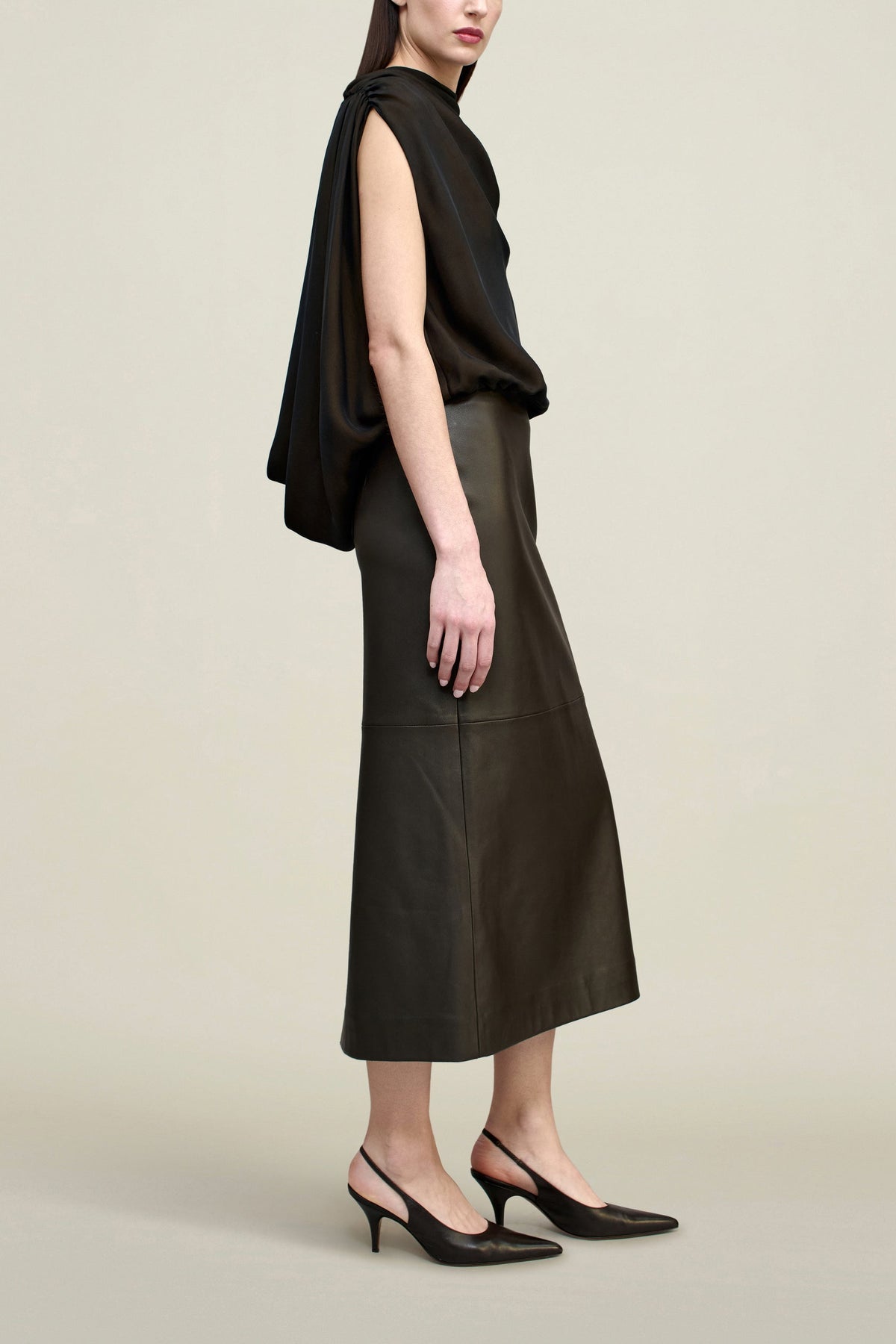 Elegantly designed bubble top featuring voluminous gathers at the shoulders, creating a high cowl neckline at the front and a deep, open cowl back. Includes adjustable spaghetti ties at the back neck and waist, allowing for a customized fit around the midriff. Made in black and gold trapped silk.
