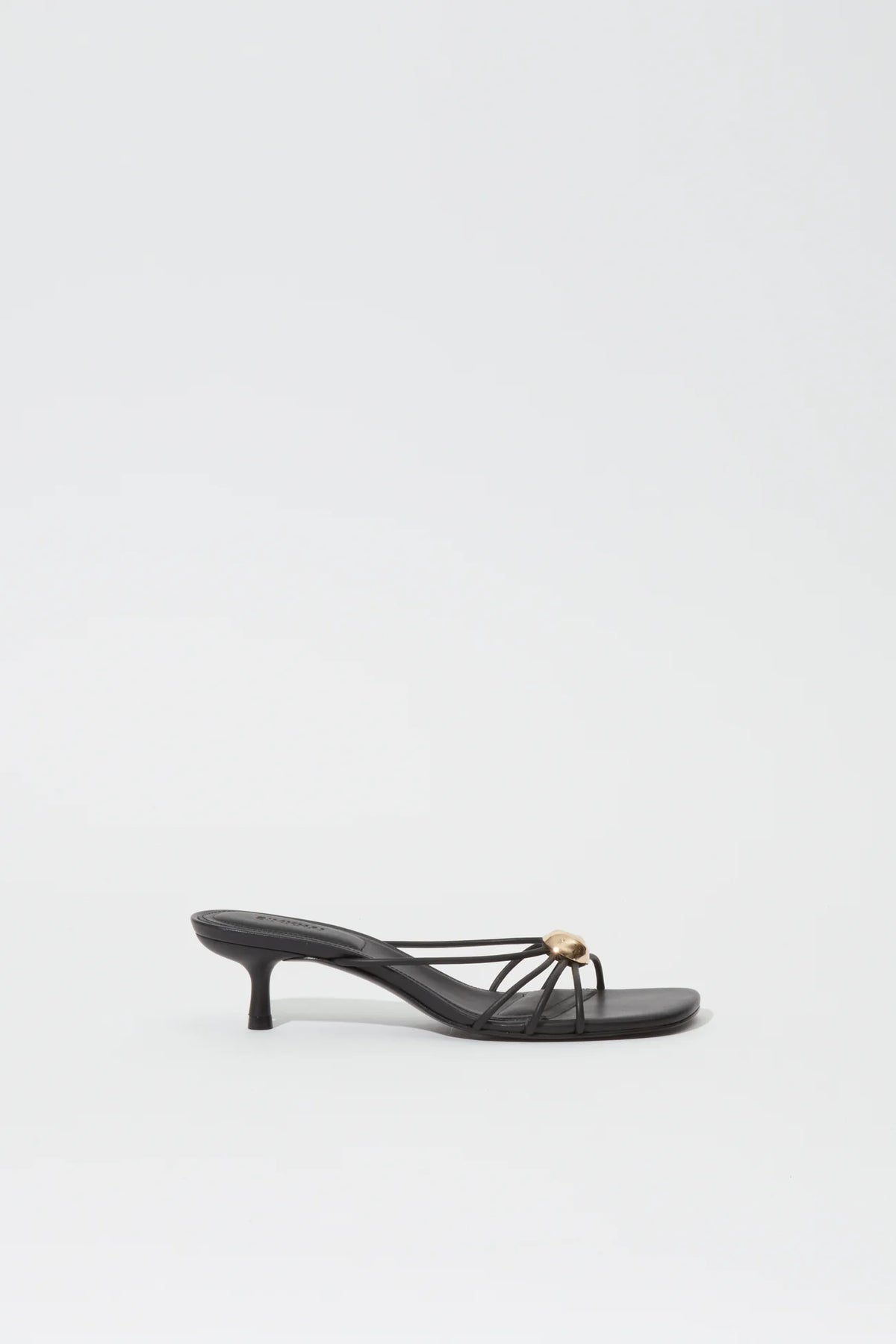 Delicate leather straps radiate from a polished golden button, creating a balanced interplay of structure and simplicity. Set on a slender heel with a squared toe, the silhouette feels both modern and timeless. Refined construction with a touch of allure.