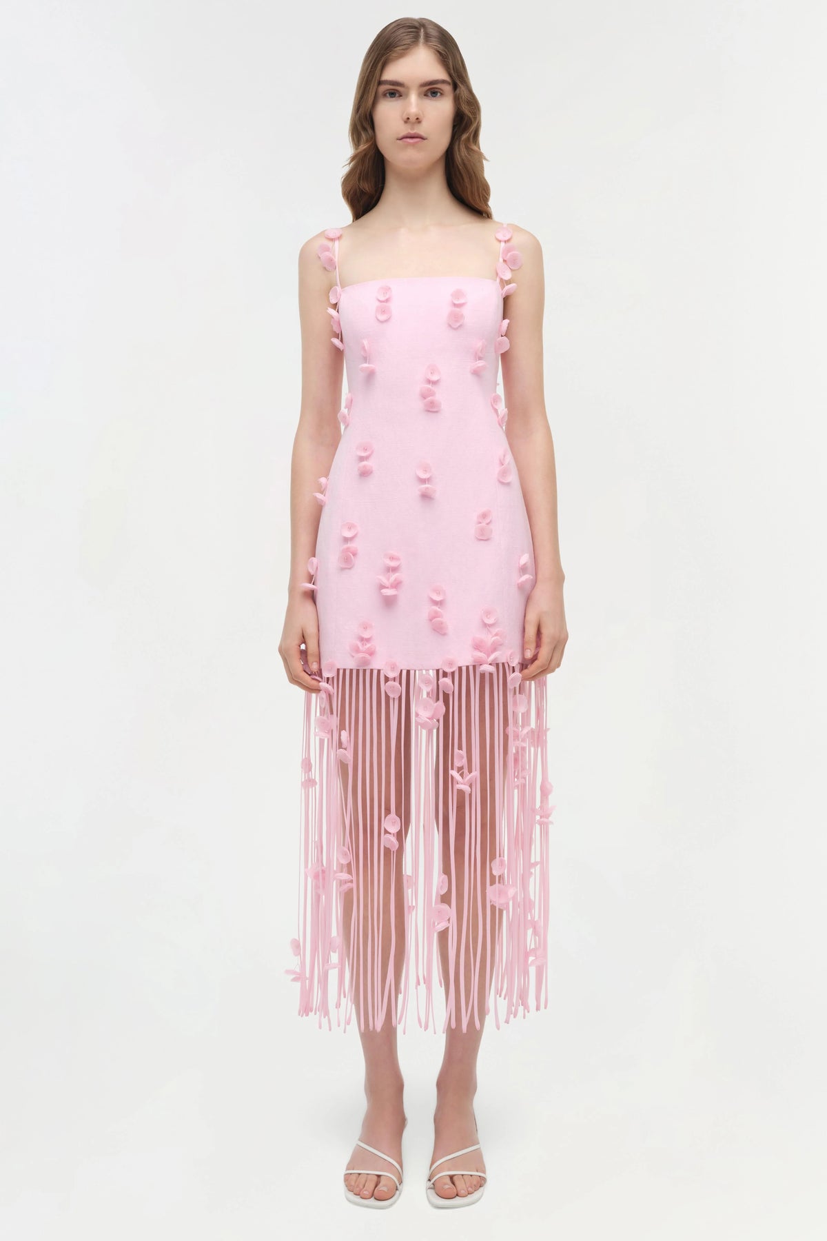Crafted in a linen blend, this midi dress features a structured bodice adorned with dimensional floral appliqués and vertical fringe detailing that allows for graceful movement. A piece that blends architectural precision with soft femininity.