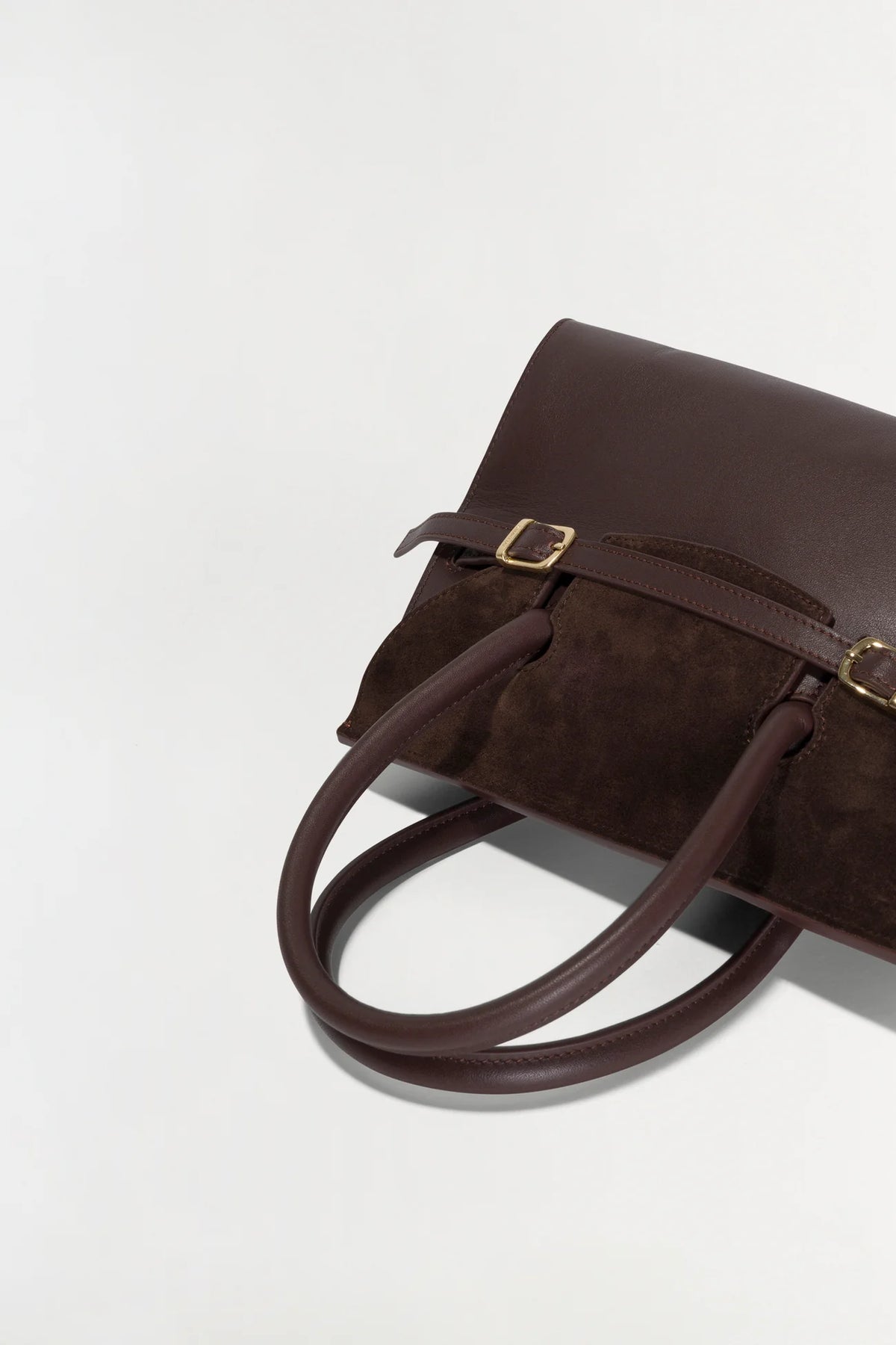 Sleek leather meets soft suede in this compact tote, finished with gold-tone buckles and a clean, structured shape.