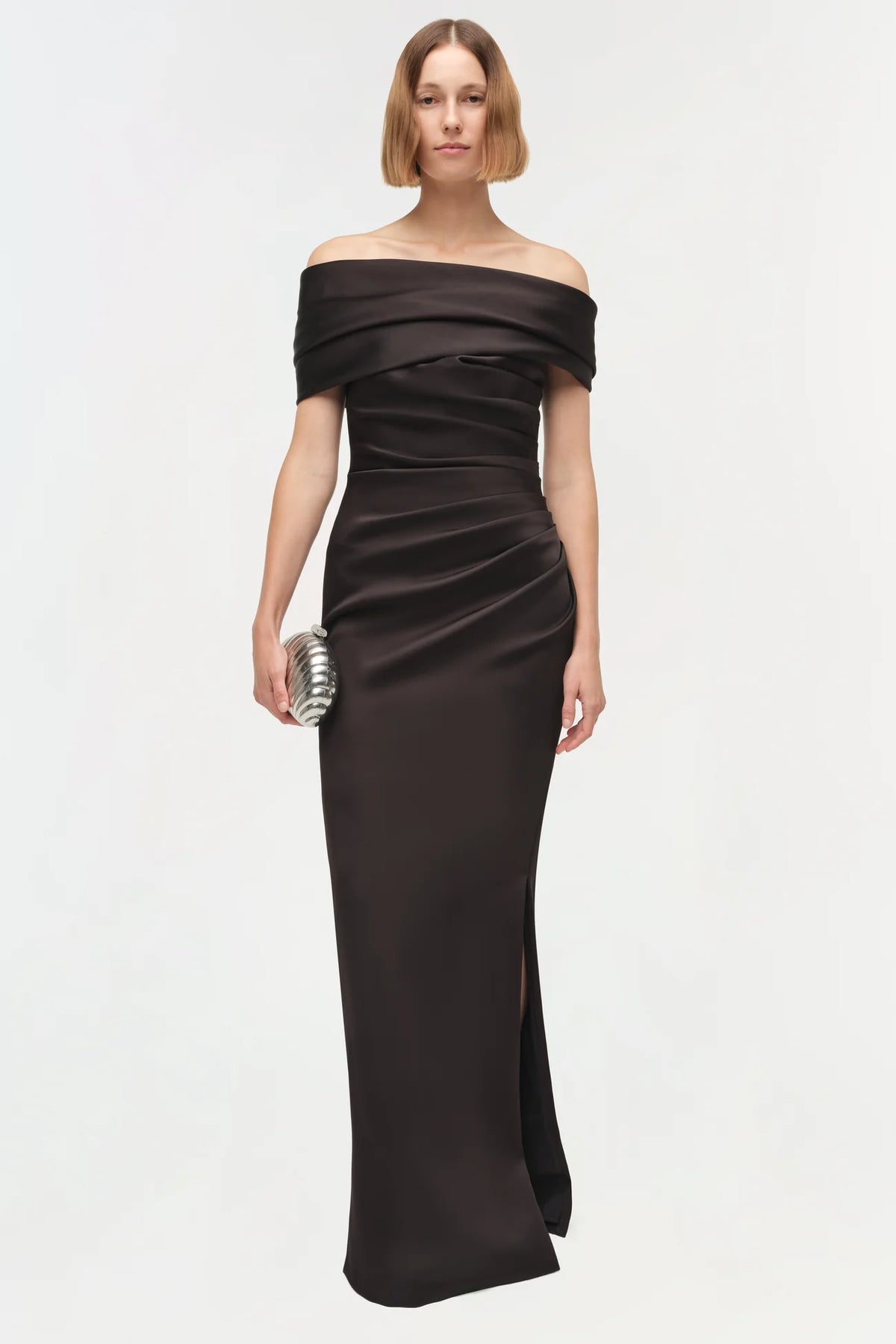 Cut from duchess satin, this gown is defined by an off-shoulder neckline that folds gracefully to frame the collarbone. Artful ruching shapes the bodice and waist, flowing into a sleek column silhouette with a subtle slit for movement. The result is an evening piece that balances timeless elegance with meticulous construction.