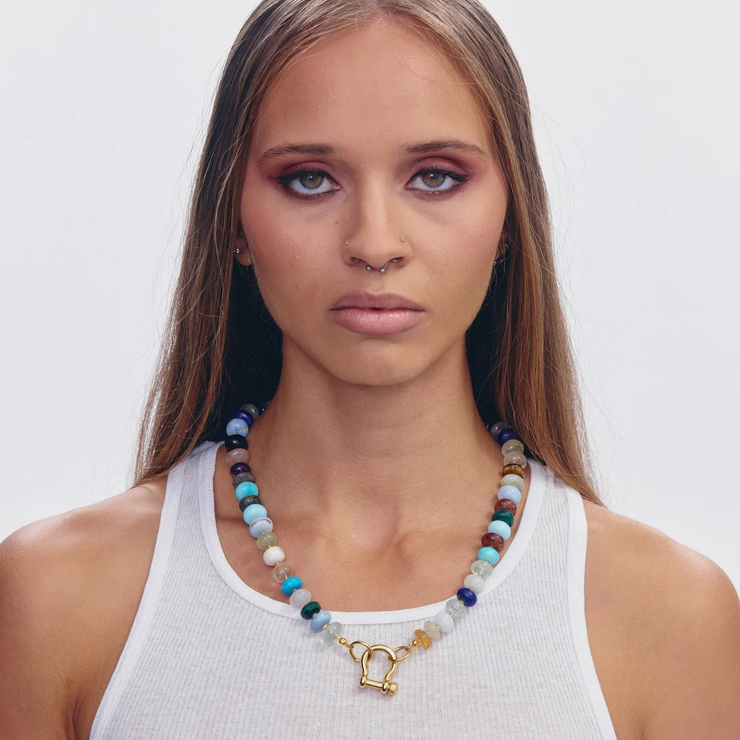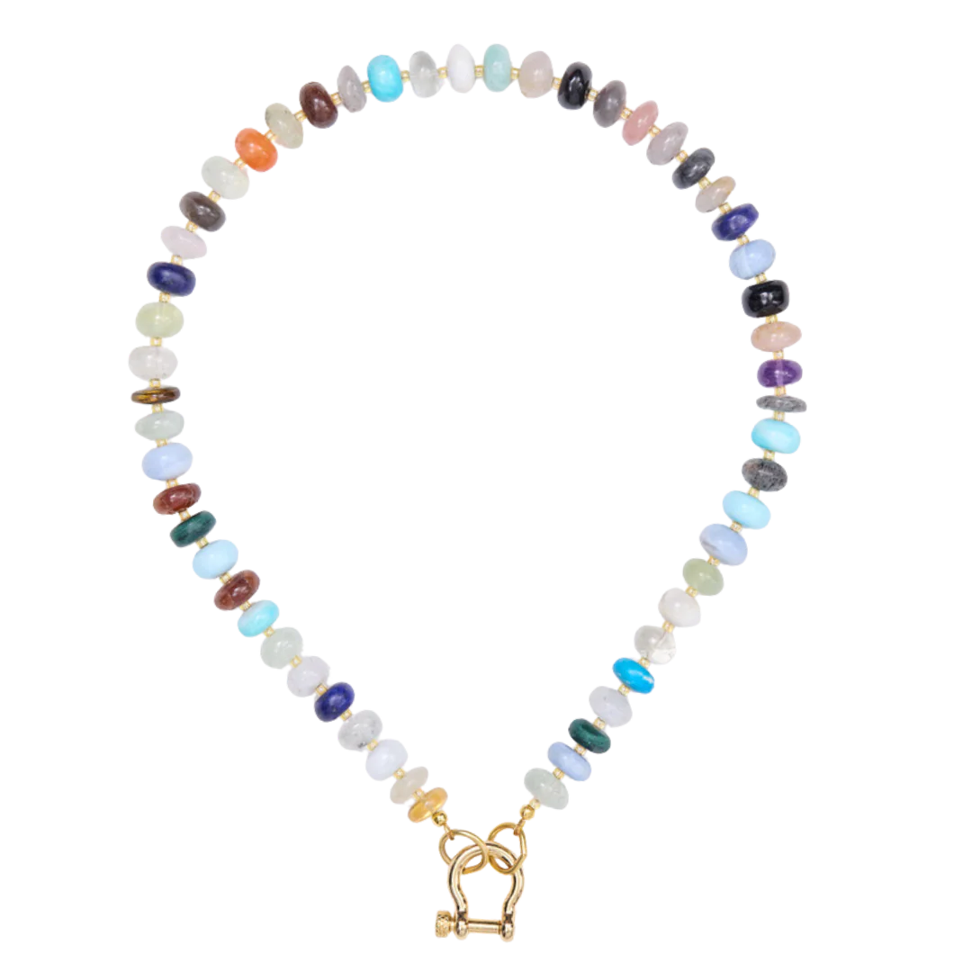 20 inch large opal, turquoise, amethyst, malachite, moonstone, and topaz necklace with 18 karat gold plated hardware and carabiner. Because this is a mixed gemstone necklace, exact stones and patterns may vary from piece to piece.