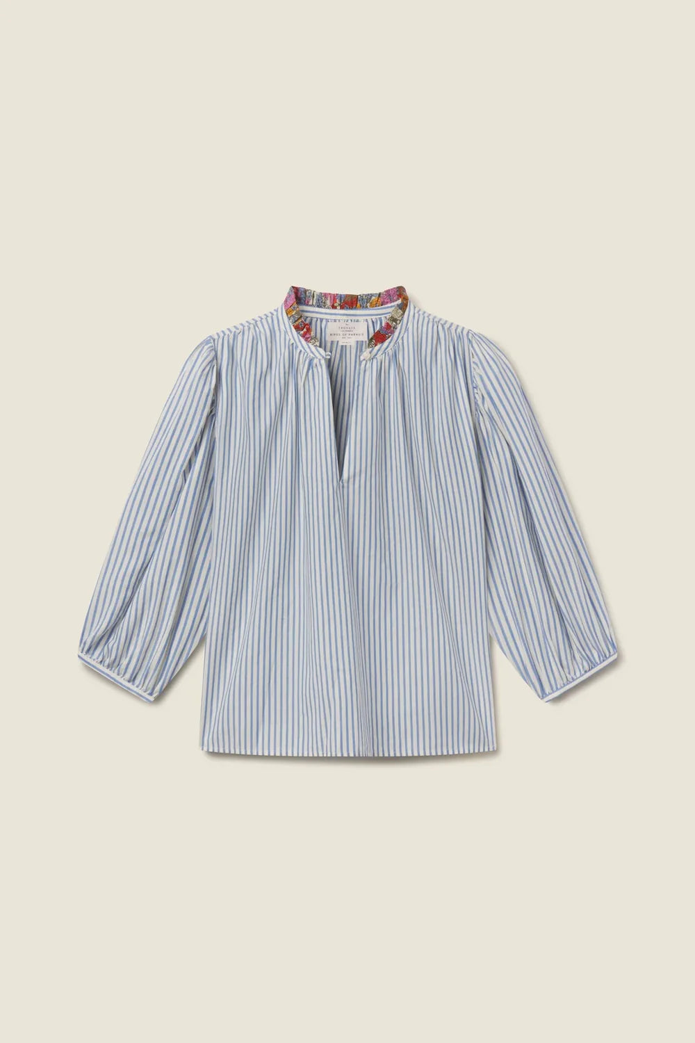 The Orly Blouse is a slightly cropped, billowy blouse with straight bottom hem, split v-neckline and buttoned crown collar. Gathered three-quarter length sleeves finished with delicate bindings. Includes Trovata's signature back detail with a gathered waist tab. Shown here in Seaside Stripe and made from coastal cotton twill.