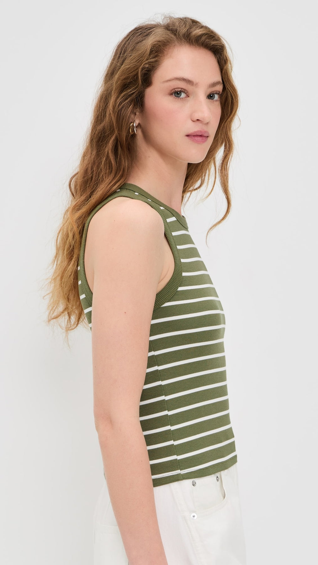 The Velvet Morie Tank in Kale channels a distinctly relaxed yet sophisticated vibe with its lightweight ribbed jersey, offering just the right amount of stretch. Its stripe pattern navigates the balance between classic and modern, making it an effortless choice for those who love a minimalist aesthetic with a twist. The sleeveless cut and crew neck design provide a sleek silhouette that exudes laid-back chic.