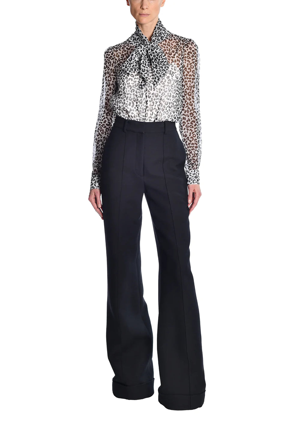 A classic wide leg trousers made in Italian Silk Wool. Features an elongating pin-tuck at the front and a cuffed ankle.
