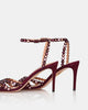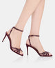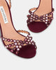 Glittering gems lend the Tequila Sandals a dose of timeless glamour, perfect for parties and elegant evenings. Made in Italy from ultra soft suede in a sophisticated blackberry hue, this open-toe pair is adorned with gleaming tonal gems along its slender straps and set on a slim stiletto heel. Pair yours with a minidress to steal the show.
