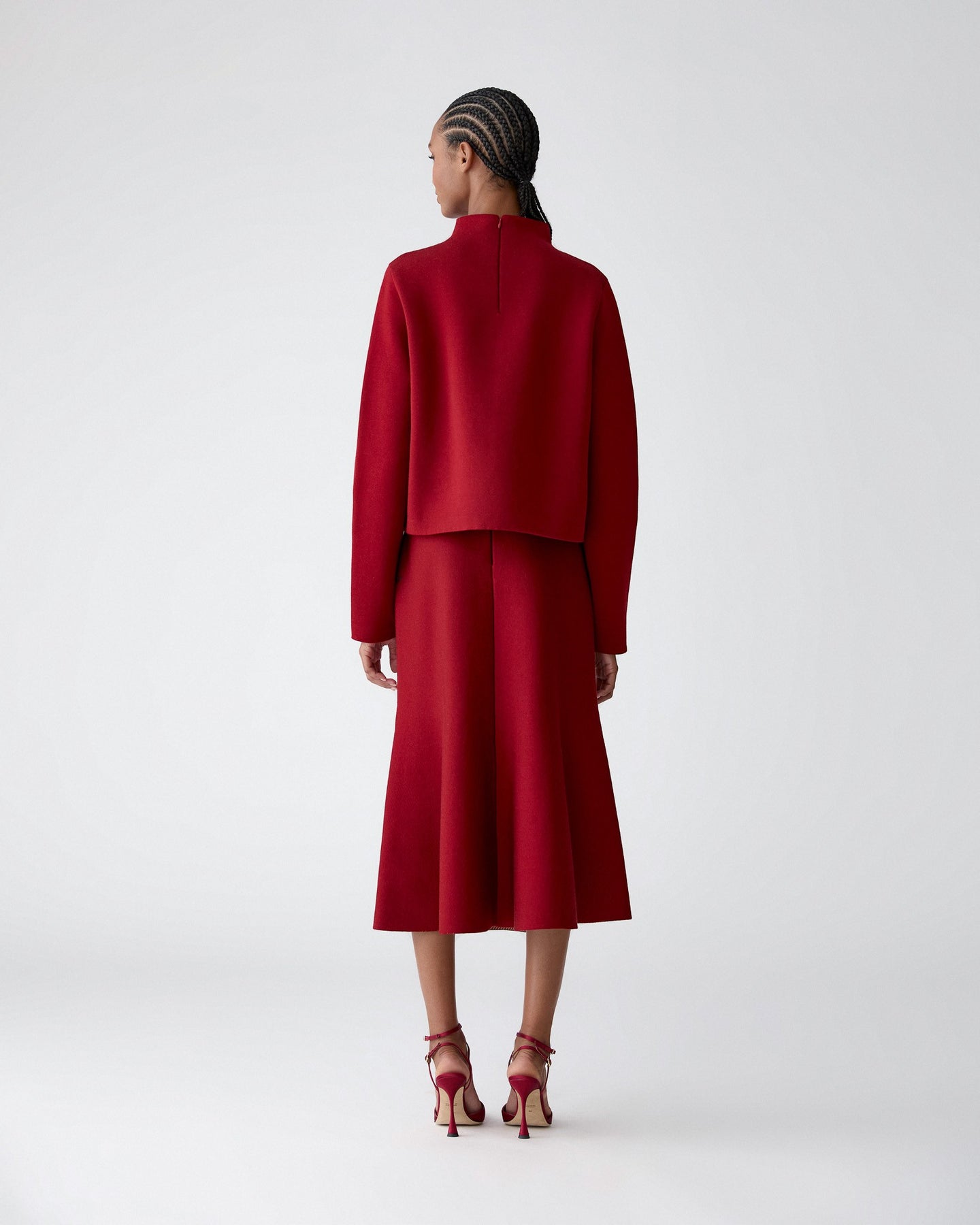 This merino wool jacquard sweater showcases a brightly hued floral motif. A broad funnel neck balances the cropped silhouette, creating a modern silhouette. Pair it with the matching jacquard skirt.