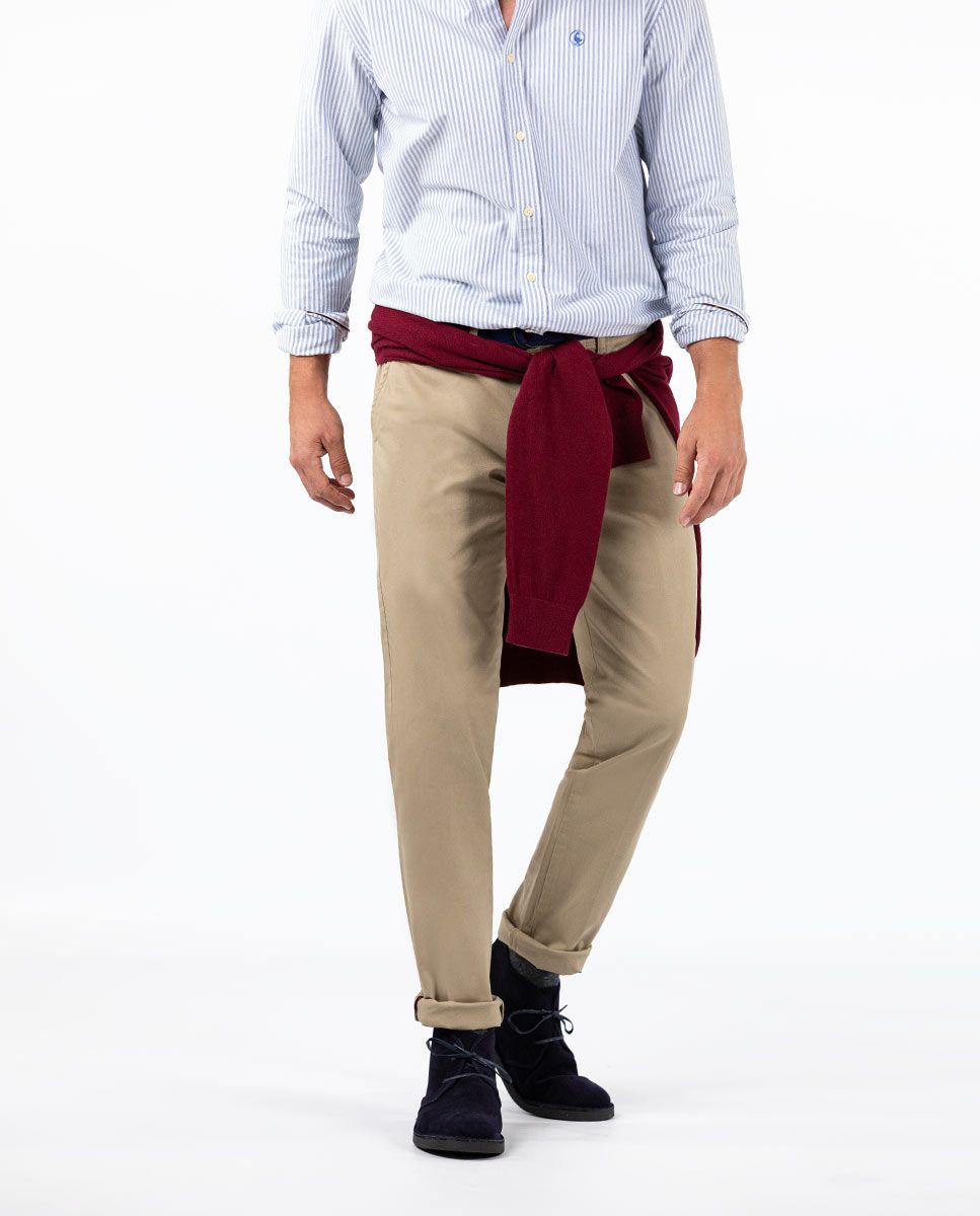Beige chinos made of BCI cotton fabric with a soft finish. Slim Fit cut, button, and zip fastening hidden by a placket. They have front pockets and back ones that are made with the main fabric and feature tie fabric piping. As a detail, they also have piping with the same tie fabric on the ticket pocket. They have the motif from the logo sewn above the back pocket. They come with a navy canvas belt.