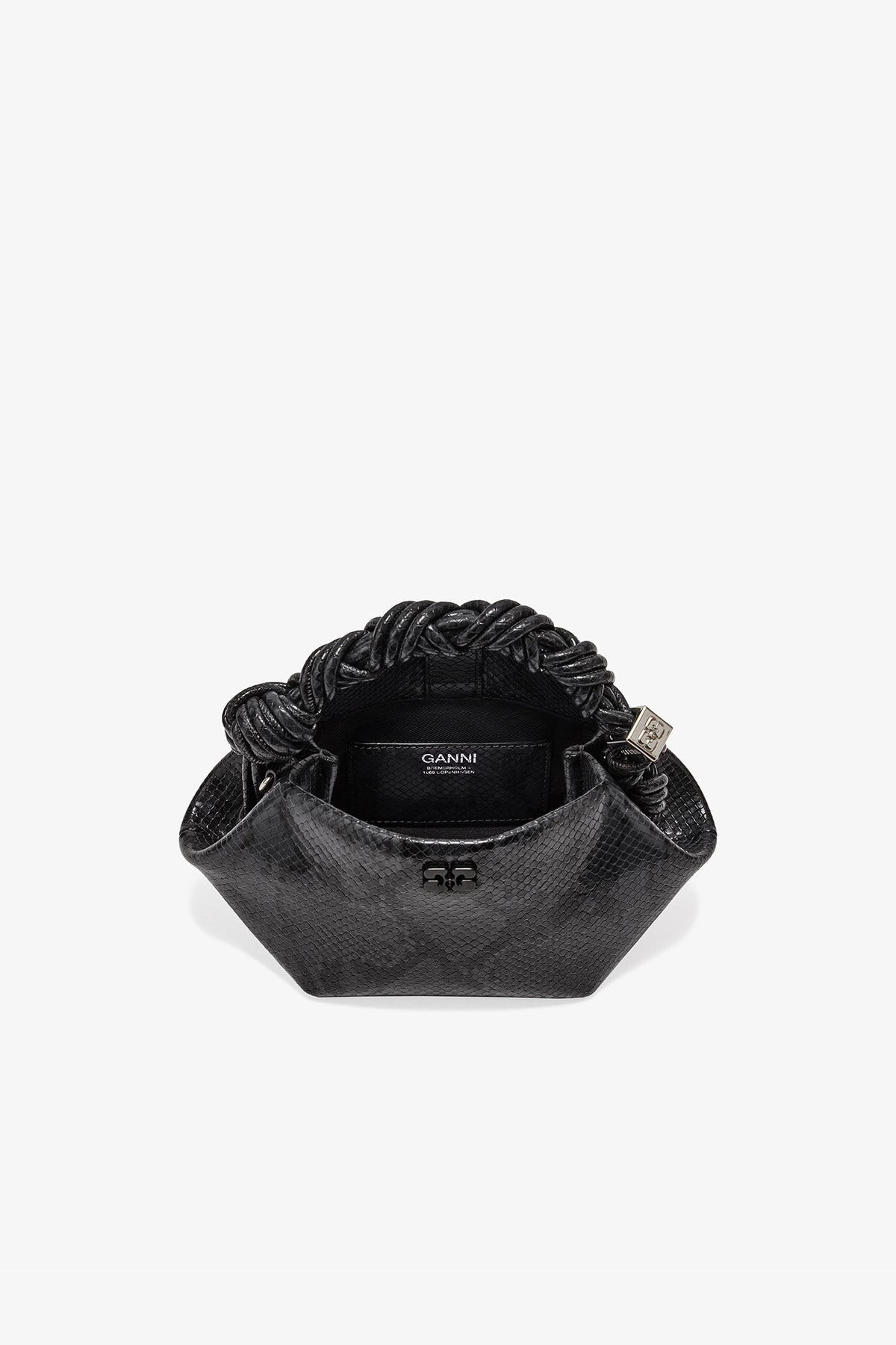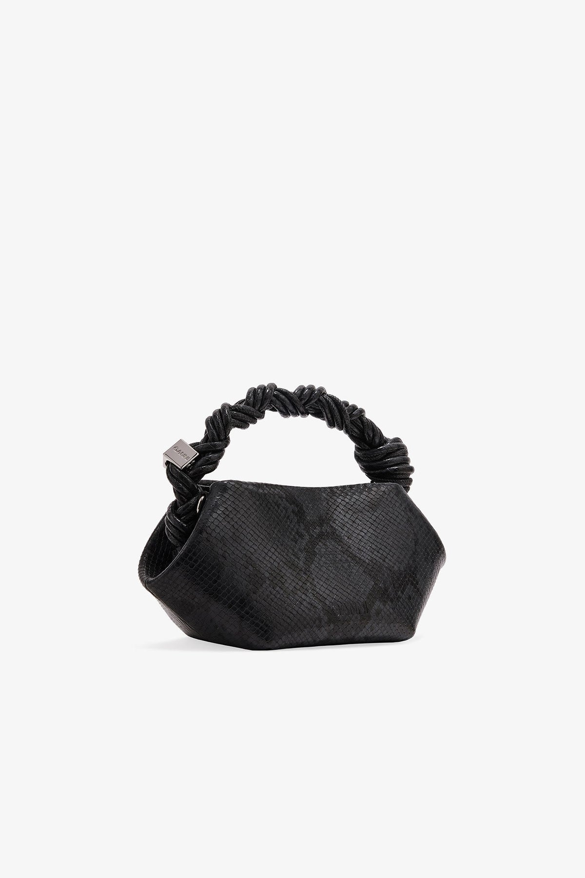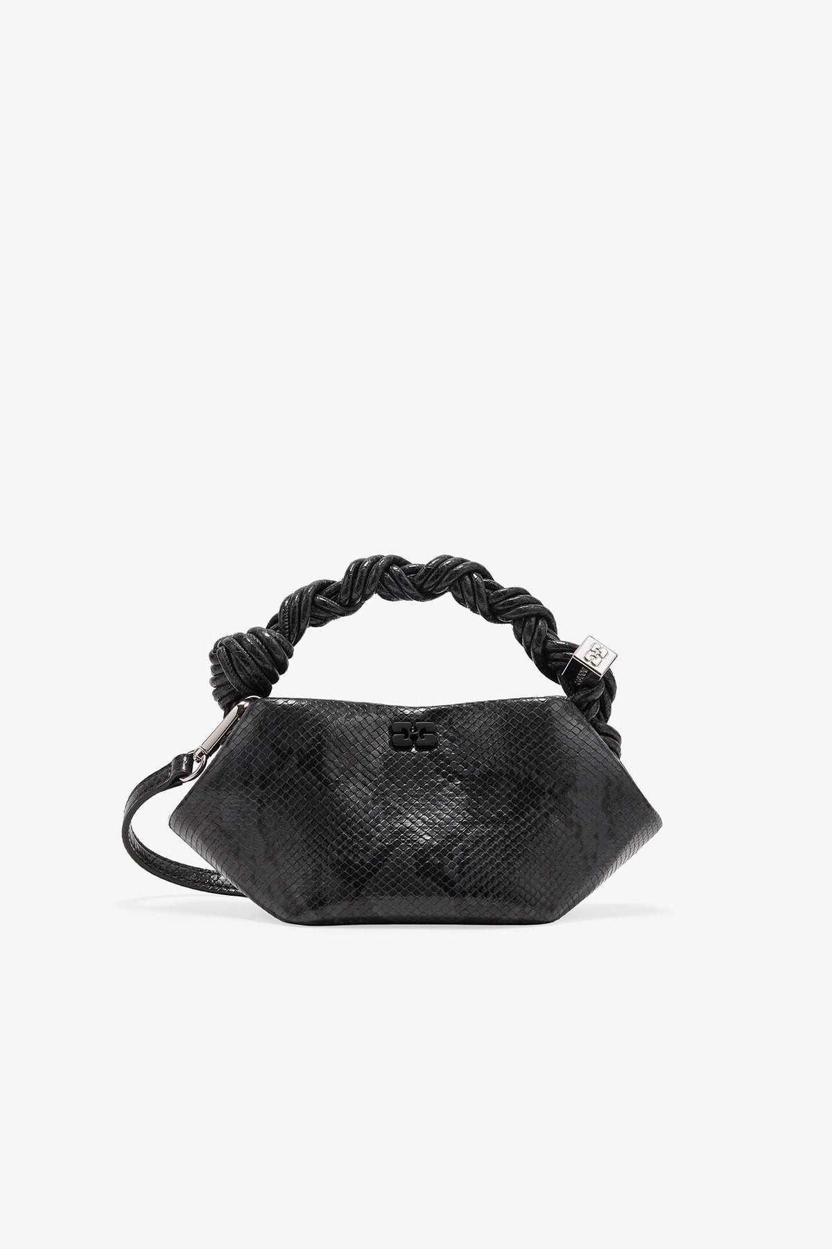 This bag features a tone-on-tone metallic GANNI Butterfly logo, a twisted handle with a braided knot, and a silver-tone metallic dice with a GANNI Butterfly logo engraved. The bag has an internal magnetic closure, a flat card pocket inside, and an adjustable and removable shoulder strap for crossbody wear.