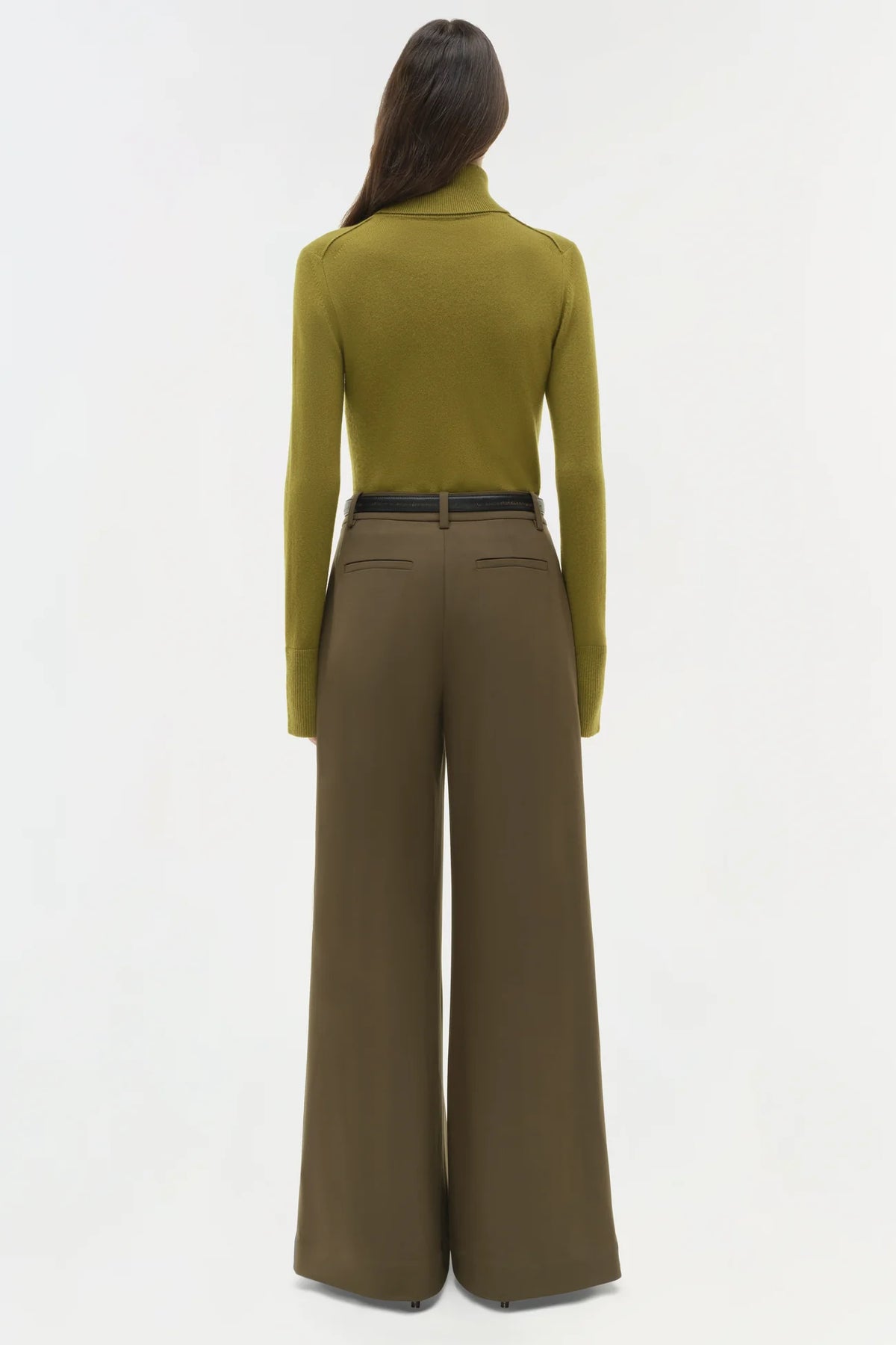 A wide leg trouser pant designed with a pleated front and welt back pockets in relaxed suiting for an impeccable drape.