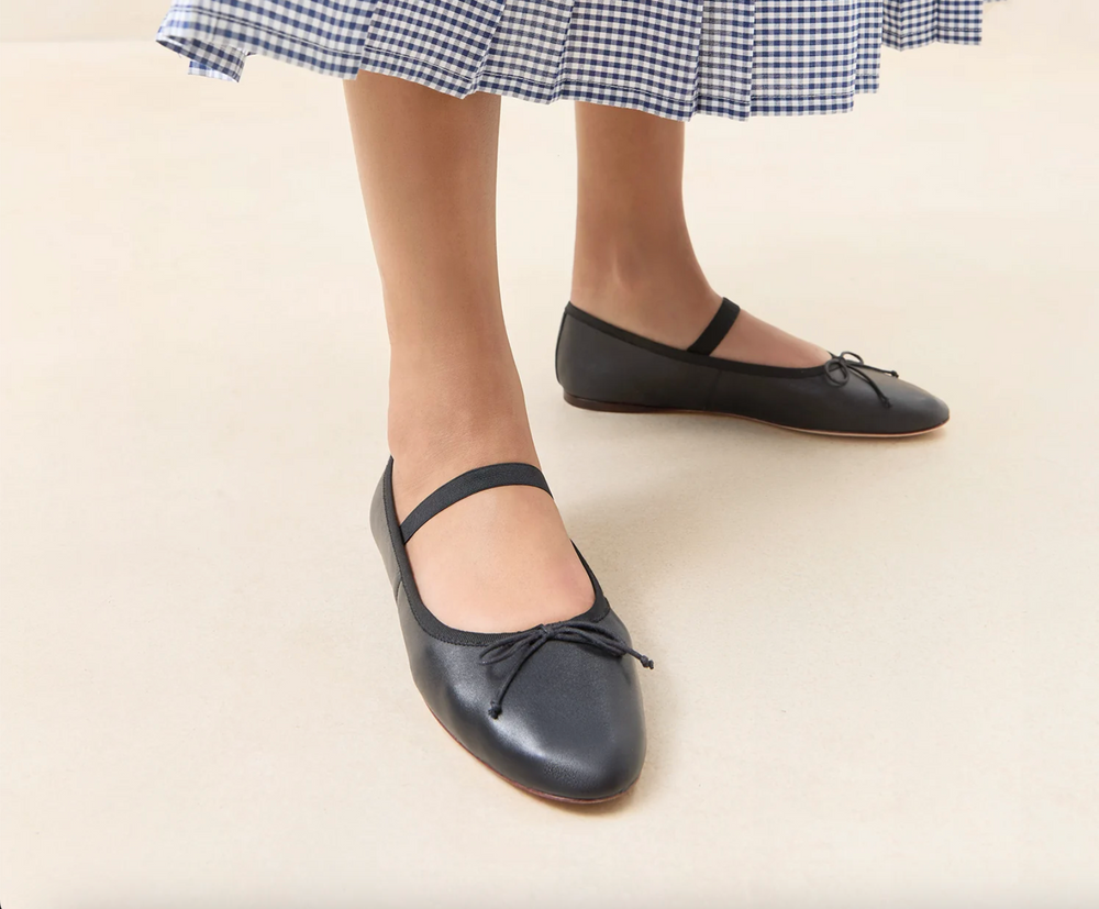 Soft ballet flat in black glove calf leather with an elastic bridge strap and bow detail. Features a padded footbed with gold stamped logo and an almond toe.