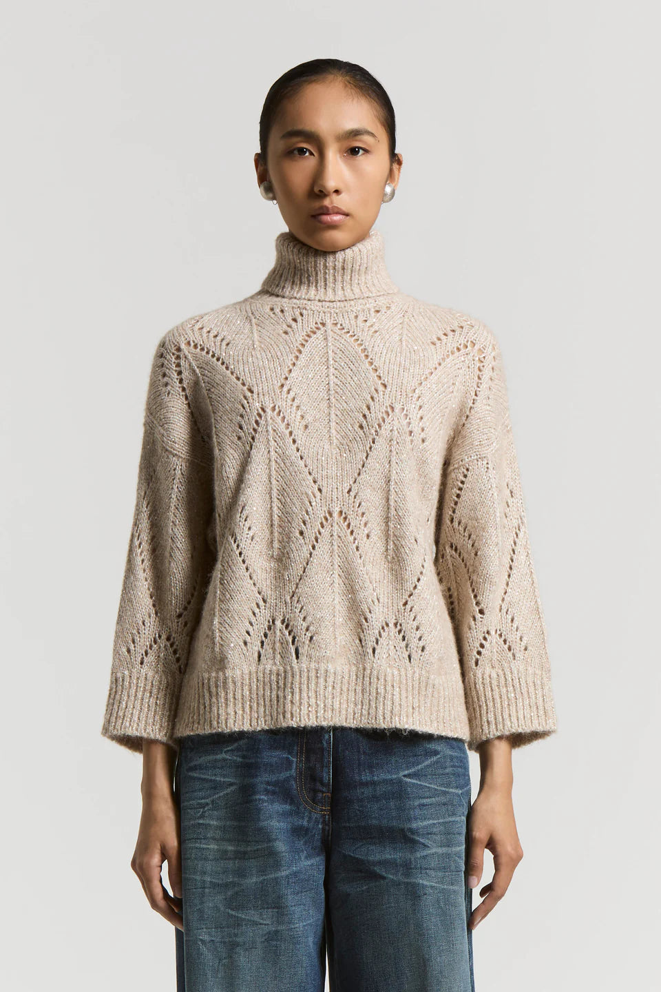 The jumper is distinguished by its warm and enveloping aesthetic, made from a soft mouliné yarn of alpaca, merino wool and cotton. This turtleneck sweater is ideal for wearing with tops and skirts from the AW25 collection, but also under jackets and blazers for a warmer and more complete look.