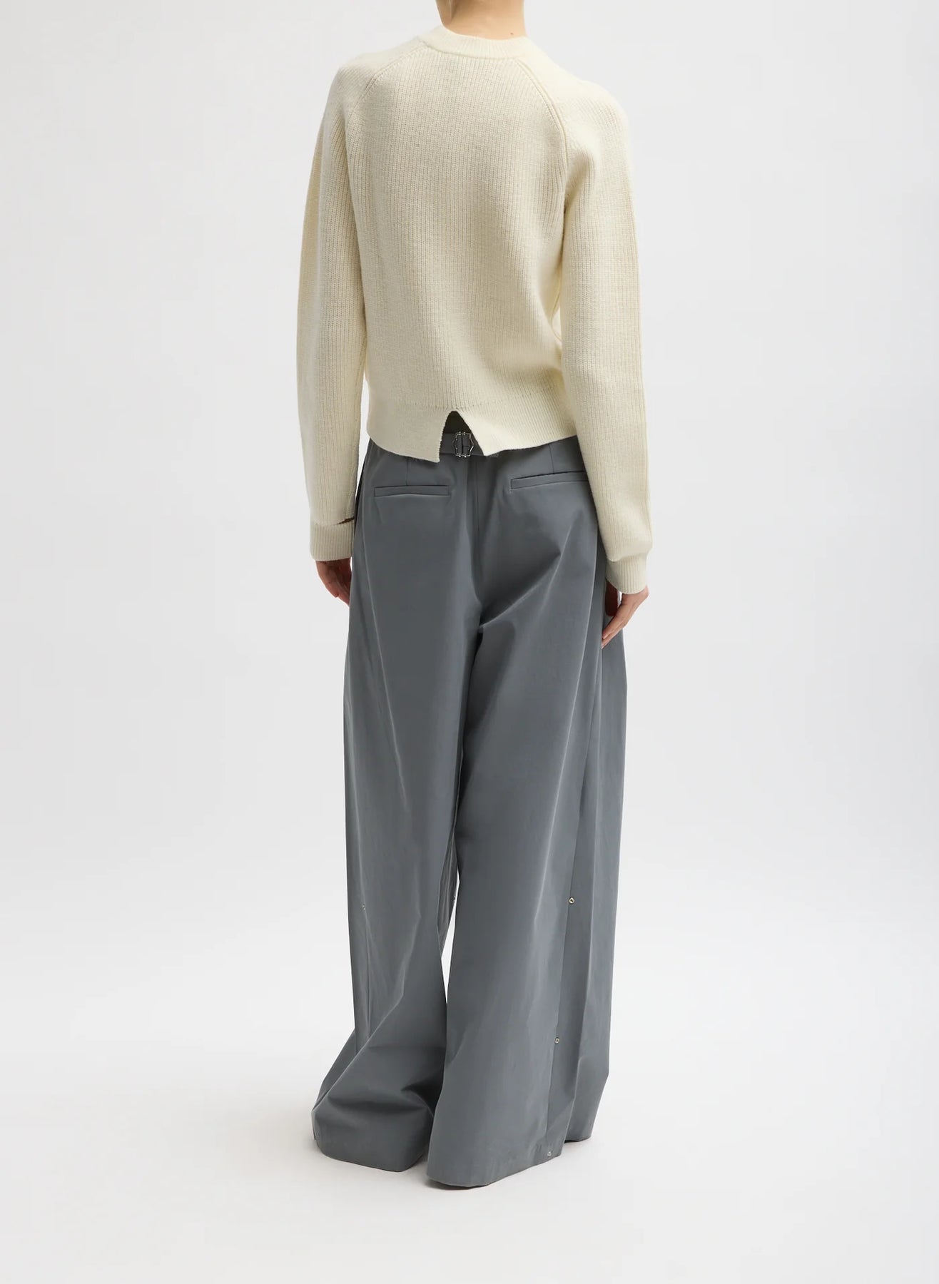 Small in scale, big on intention. The Cardigan Stitch Wool Shrunken Crewneck Pullover is crafted from a dense, luxurious wool knit with rich texture and a shrunken fit. Designed to hit at just the right spot for effortless layering, this piece features a subtle back slit for a touch of unexpected detail. It’s the kind of knit that finishes a look without overpowering it, refined, easy, and endlessly wearable. Style it back to your Bio Twill pants for an effortless Big-Slim-Skin proportion play that grounds the look while keeping it modern.
