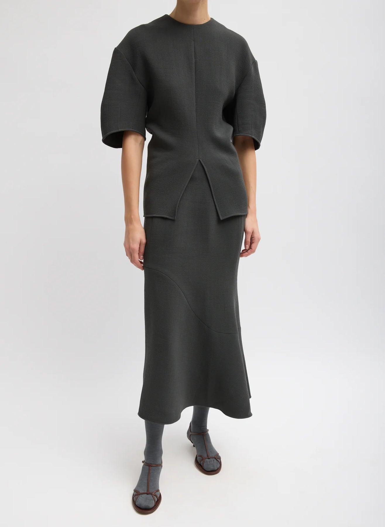 Crafted from Italian virgin wool with a compact yet drapey crepe finish, the Marte Fluid Skirt offers refined movement and a sleek silhouette. Featuring a zipper closure at the back, this skirt strikes the perfect balance between structure and flow. Pair it with the coordinating Slit Front T-Shirt for polished layering, or dress it down with the Menswear Flannel for a relaxed, modern take.